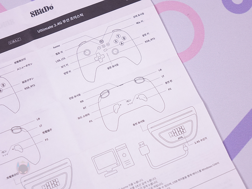 제품 박스를 열어보면, 흔들리지 않게 커버를 적용하고 있으며, 구성품은 얼티메이트 2.4G 무선 컨트롤러, 충전독, 유선 및 USB충전케이블, 제품설명서로 간단하게 이루어져 있습니다. 물론, 제품 설명서에는 한국어도 포함되어 있죠.