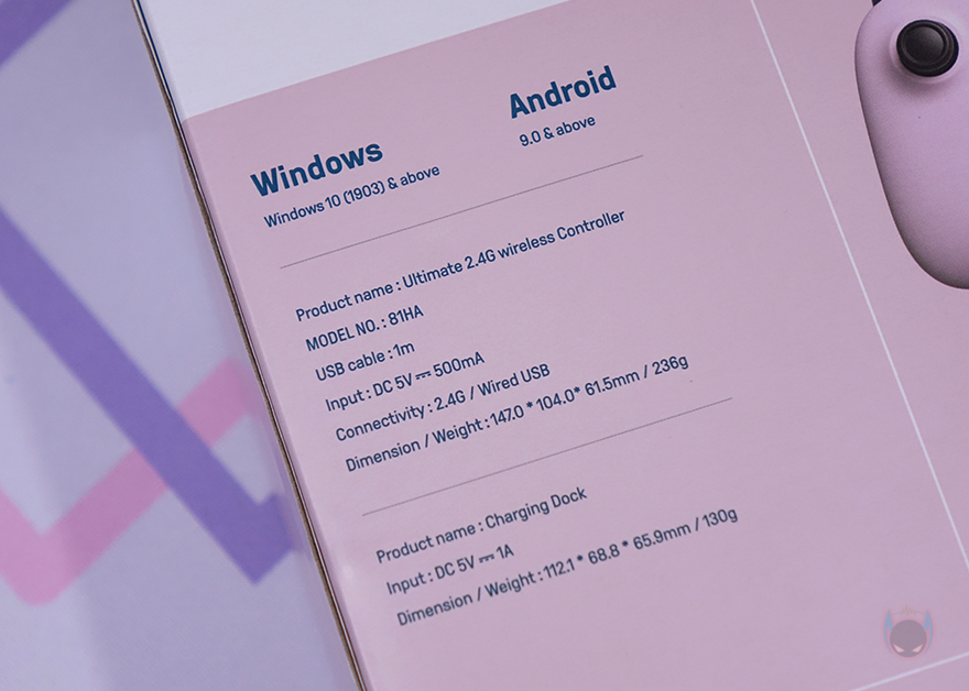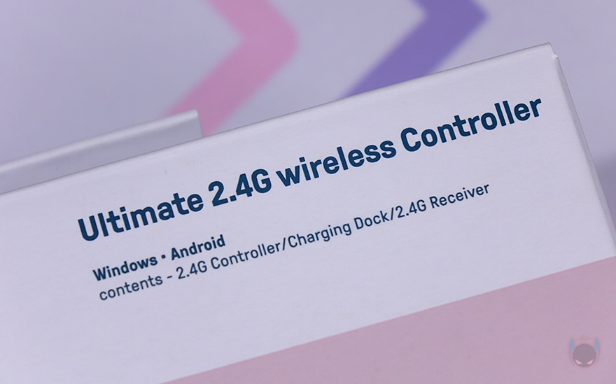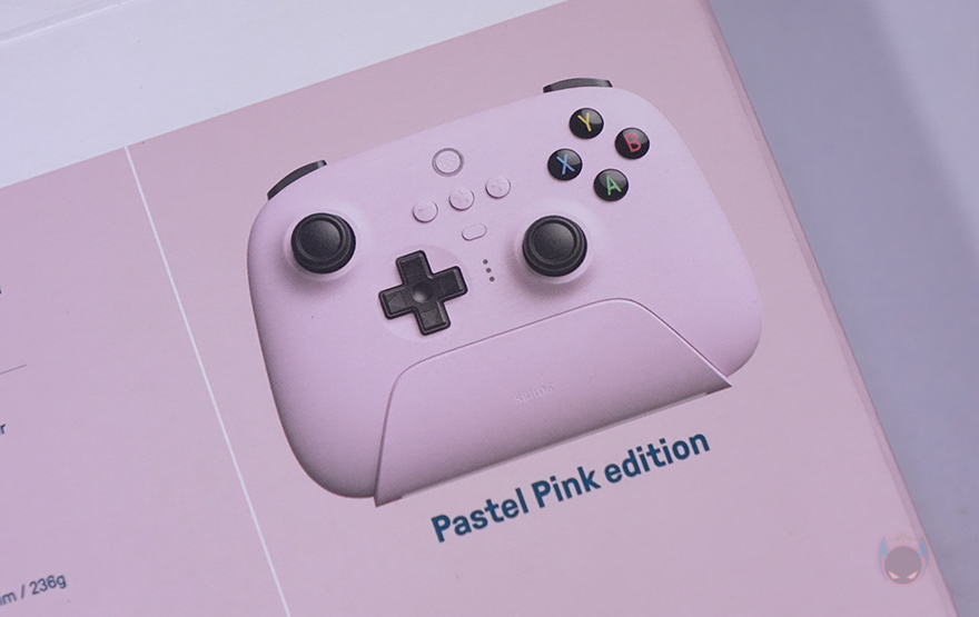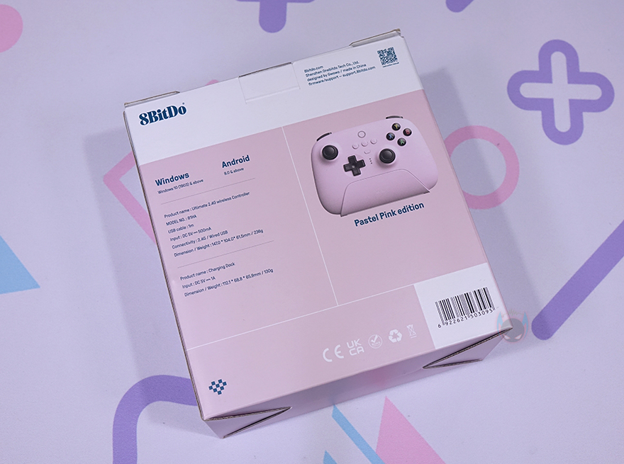 제품 패키지부터 살펴보면, 패키지는 박스 포장형태로 얼티메이트 2.4G 무선 컨트롤러는 3가지 색상(Black, White, Pink)으로 출시되었는데 색상에 맞춰서 박스 색상과 전면에 제품 이미지를 담고 있습니다. 제품 이미지를 통해 개봉 전 미리 게임 패드 디자인도 확인이 가능한데, 한눈에 봐도 Xbox 게임패드 콘셉트와 유사하다는 걸 알 수 있죠. 그리고, 게임패드를 거치하고 있는 충전독(charging-dock)도 제품 색상에 맞췄다라는걸 알 수 있습니다. 모델명 아래에는 플랫폼 지원과 구성품 표기를 해놨으며, 박스 후면에도 제품 사양을 상세하게 표기해 놨죠. 그리고, 3가지 색상 중 핑크색상 모델의 정확한 명칭은 '파스텔 핑크 에디션(Pastel Pink Edition)'이라고 표기도 해놨습니다.
