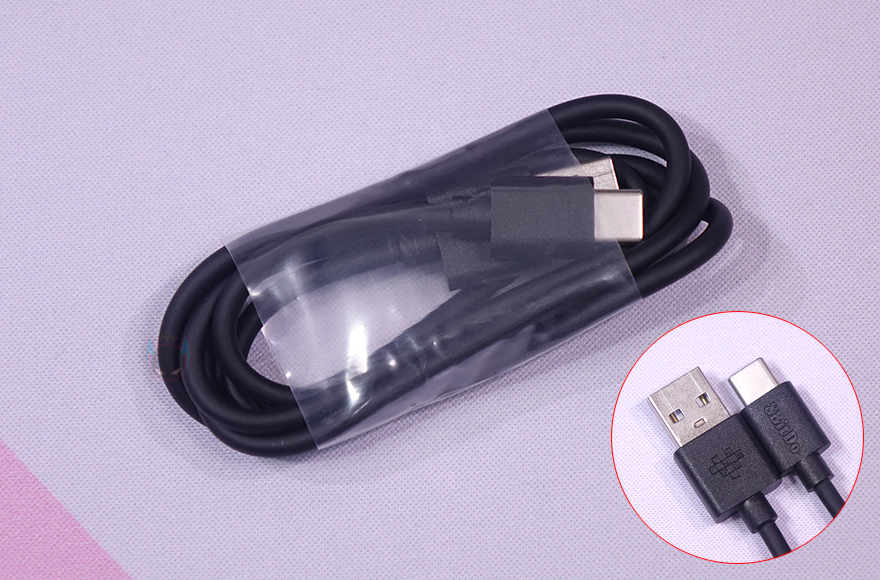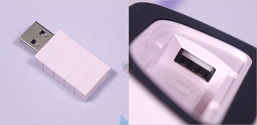 충전독 밑바닥에는 미끄럼방지를 위해 패드를 테두리 부분에 기본 부착해 놨으며, 패드가 없는 가운데 부분에는 무선 2.4G 이용 시 사용되는 동글이 수신기(dongle receiver)가 수납되어 있습니다. 참고로, 수납할 때는 포트 방향을 보고 꽂아야 하는데, 수신기에 로고 부분이 바깥쪽으로 보이게 수납하면 됩니다. 끝으로, 제공되는 USB 충전케이블은 총 1m 길이에 USB Type-A to C 인터페이스를 가졌습니다.