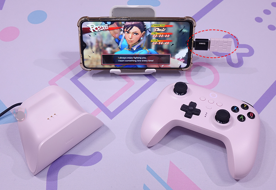직접, 8Bitdo 얼티메이트 2.4G 무선 컨트롤러(Ultimate 2.4G wireless controller)를 사용해 보면, 일단 충전은 충전독에 올리는 순간 바로 진행되며, 충전이 시작되면 충전독 아래 LED 램프가 점등됩니다. 물론, 반대로 충전독에서 분리되면 LED 램프도 바로 꺼지죠. 그리고, 특별히 유선이나 무선 2.4G 연결법은 없습니다. 다른 제품들처럼 유선은 그냥 케이블만 연결하면 바로 사용할 수 있고, 무선 2.4G 역시 동글이 수신기만 PC나 모바일 같은 외부 기기에 연결하면 바로 연결 인식이 됩니다.