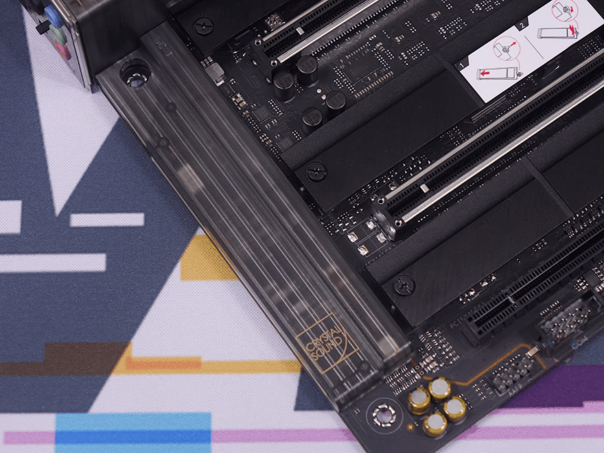 M.2 SSD 슬롯은 모두 PCIe4.0x4 규격으로 PCIe 1번 슬롯 위에 1개, PCIe 2번 슬롯 위에 1개, PCIe 3번 슬롯 위에 2개 배치로 총 4개의 슬롯을 갖추고 있죠. 또한, M.2 SSD 슬롯 1번과 3번은 22110 사이즈까지 장착할 수 있으며, 2번과 4번 슬롯은 2280 사이즈까지 장착할 수 있고, 모든 슬롯에는 SSD를 무나사로 장착할 수 있게 Q-래치를 적용하고 있습니다. 그리고, PCIe 3번 슬롯 아래에는 추가로 SATA 커넥터 2개와 12V, 5V RGB 헤더가 배치되어 있습니다.