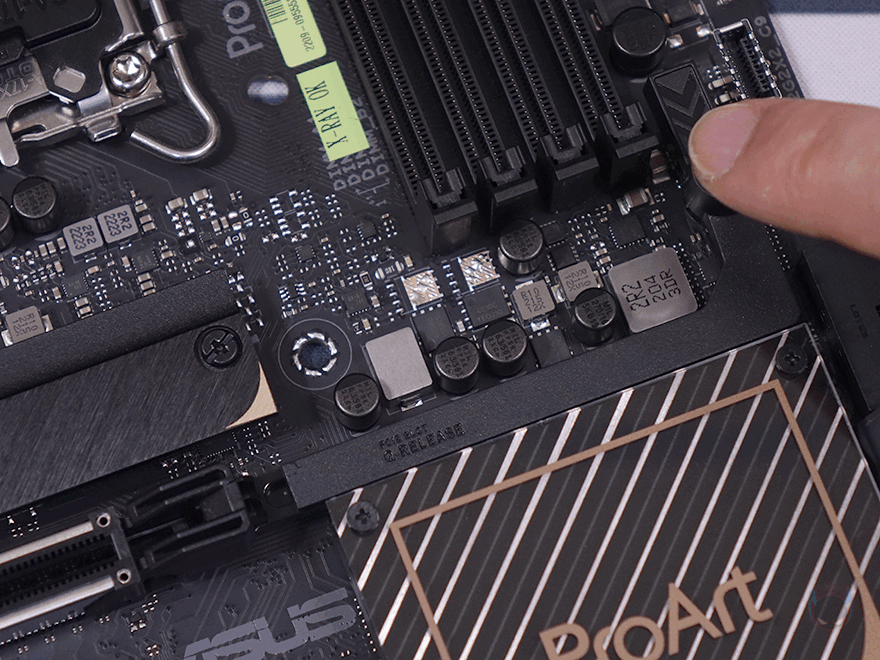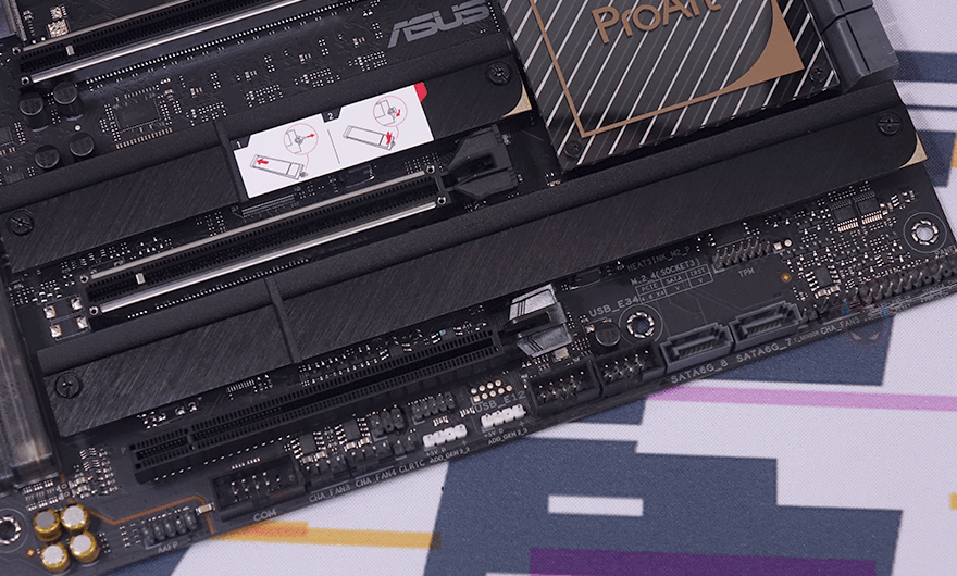 메인보드 오른쪽 한쪽에는 메인칩셋인 Z790칩셋 배치와 함께 발열 해결을 위해 역시 방열판을 적용하고 있으며, 방열판 오른쪽에는 S-ATA 커넥터 6개와 USB 3.2 Gen 헤더가 배치되어 있습니다. 그리고, 방열판 위쪽에는 그래픽카드가 장착되는 PCIe 1번 슬롯에 래치를 쉽게 잠금/해제할 수 있게 Q-릴리즈 장치를 적용해 놨습니다. PCIe 슬롯은 총 3개 구성으로 이중 1번과 2번 슬롯은 PCIe 5.0 규격과 함께 ProArt B650-CREATOR 메인보드와 마찬가지로 듀얼 PCIe x8배속으로 지원합니다. 물론, 1번 슬롯만 사용할 때는 x16배속이죠. 그리고, 내구성 강화를 위해 둘 다 스틸 커버를 적용했으며, 슬롯 간격마다 M.2 SSD 슬롯들을 배치해 놨는데, 모두 방열판이 적용되어 있습니다.