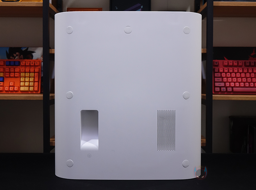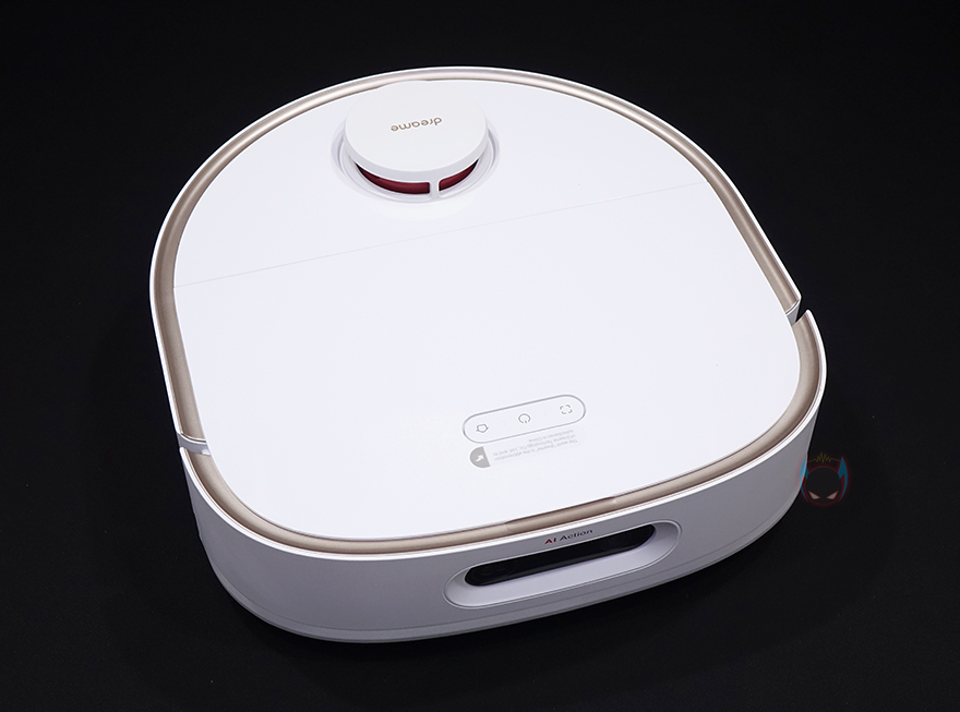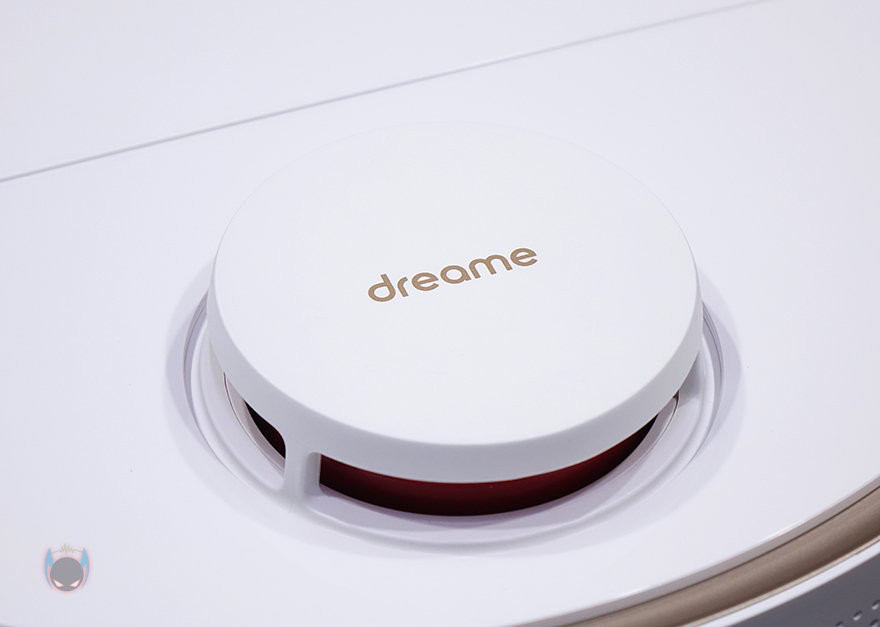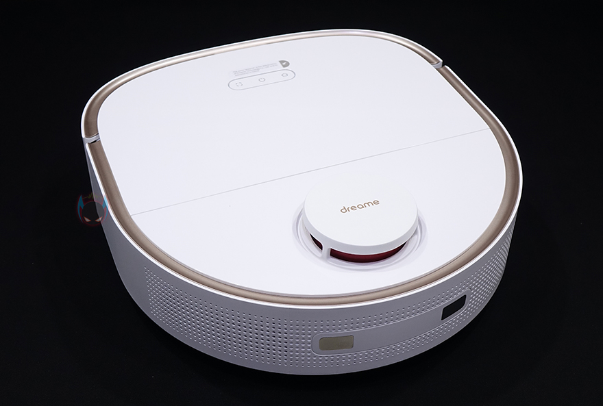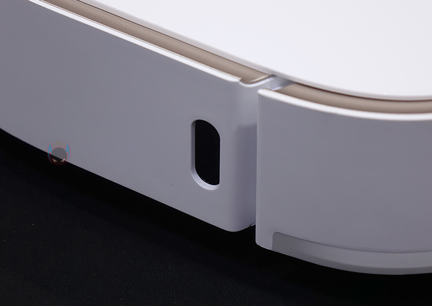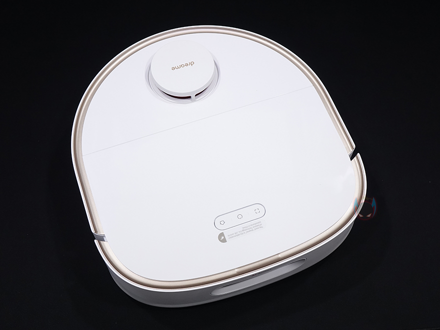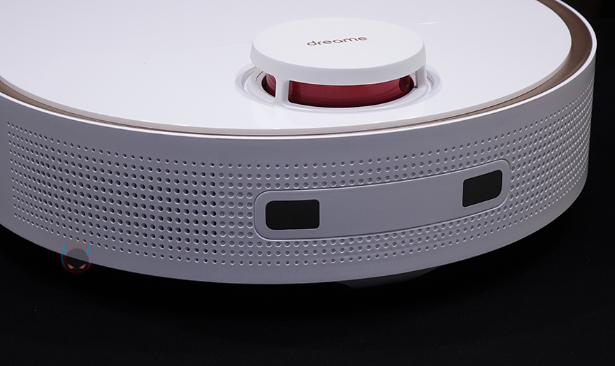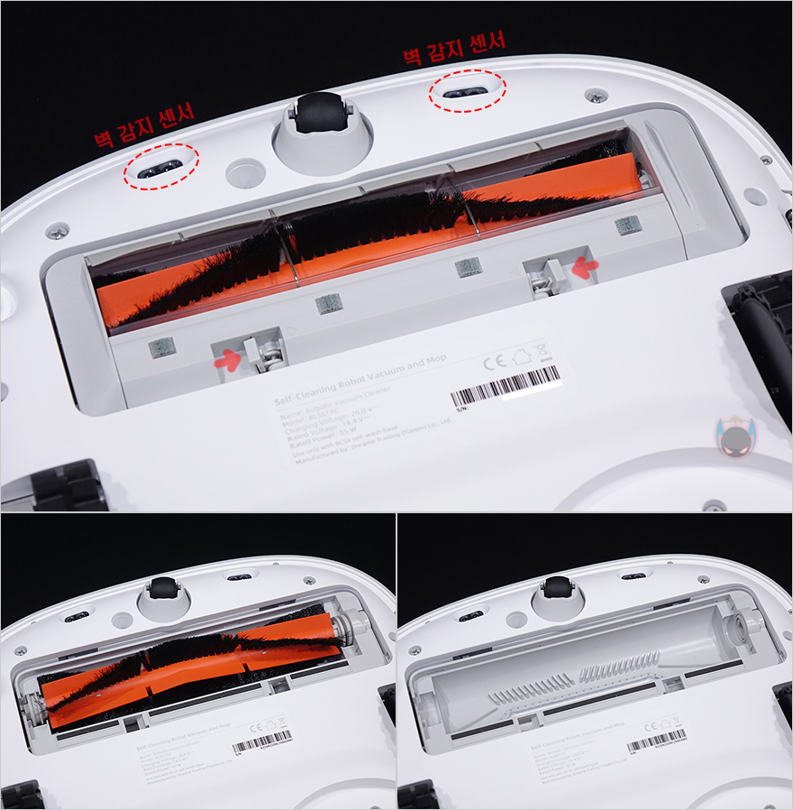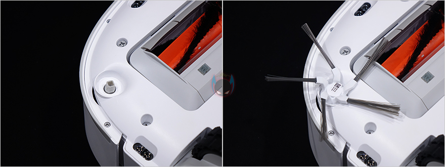 상단 뒷부분에는 거리 감지의 LDS(Laser Distance Sensor) 센서가 내장된 위치로 커버를 적용하고 있으며, 커버 상단에 로고를 새겨놨습니다. 그리고, 로봇청소기 후면에 베이스 스테이션에서 충전할 때 연결되는 접지가 적용되어 있죠.