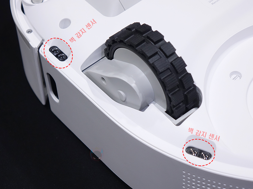 W10 Pro 로봇청소기 바닥 부분에는 앞부분에 진공 청소 시 먼지 및 불순물 흡입 효율이 높도록 메인 브러시가 장착되어 있으며, 브러쉬 바로 뒤쪽에 양쪽 걸쇠 장치를 누르면 쉽게 분리해서 청소할 수 있습니다. 또한, 메인 브러시 왼쪽에는 모서리 같은 구석을 청소할 수 있게 사이드 브러시를 장착할 수 있는데, 끼우는 방식이라 쉽게 탈부착할 수 있습니다. 그리고, 맨 앞부분 중앙 작은 바퀴를 기준으로 양쪽에는 벽 감지를 할 수 있는 센서가 장착되어 있으며, 가운데 양쪽으로는 문턱 같은 높이를 올라 내릴 수 있게 메인 바퀴가 배치되어 있는데, 각 메인 바퀴 앞뒤로도 벽 감지 센서가 배치되어 있습니다.