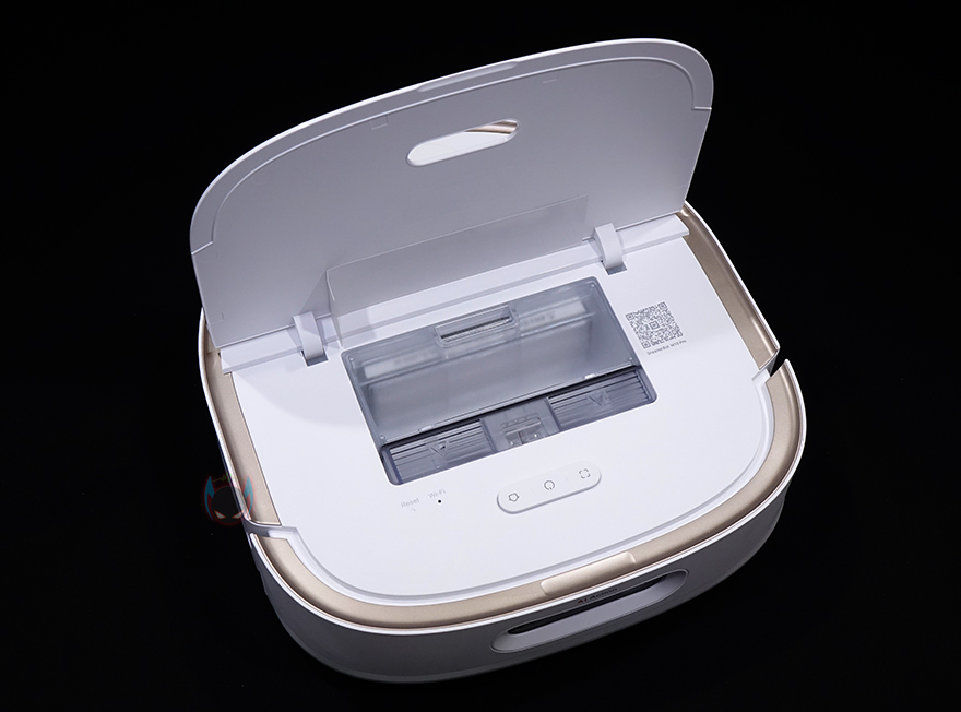 로봇청소기 상단에는 앞부분에 터치 버튼 배치와 함께 먼지통이 내부에 수납되어 있는데, 상단 커버를 올리면 쉽게 열리면서 확인할 수 있습니다. 또한, 커버를 열면 먼지통 앞부분에 초기화 버튼과 WiFi 연결상태를 확인할 수 있는 LED 인디케이터도 배치된 것을 확인할 수 있죠. 먼지통은 앞쪽 걸쇠장치를 누르면 쉽게 분리가 되고, 먼지통 용량은 450ml입니다. 당연히 먼지통에는 필터도 적용되어 있죠. 그리고, 앞부분에 배치된 터치 버튼은 가운데 전원 버튼, 집모양의 버튼은 베이스 스테이션으로 복귀하는 기능, 나머지 버튼 하나는 구역청소를 해주는 기능입니다.
