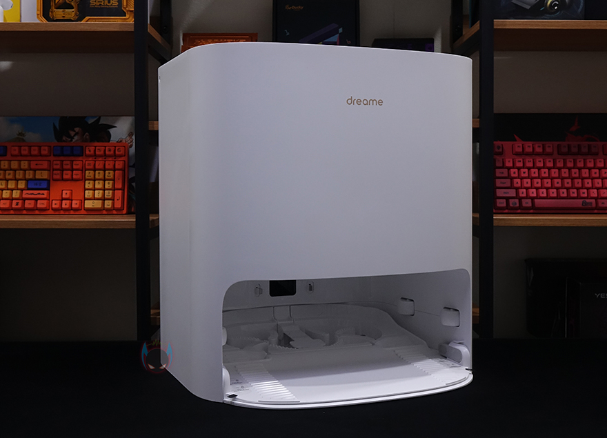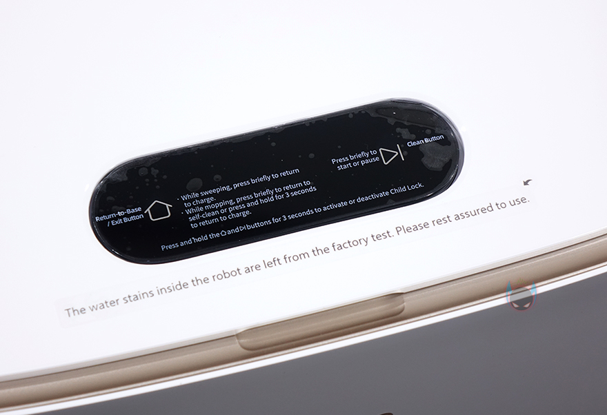 로봇청소기의 충전과 물걸레 패드를 세척/건조시켜주는 베이스 스테이션은 동일한 기능을 가진 다른 제품들과 비슷한 디자인으로 아래쪽 로봇청소기 충전 삽입구를 보면 안쪽에 물걸레 패드를 청소할 수 있게 회전 장치가 적용된 것을 확인할 수 있습니다. 그리고, 맨 안쪽에는 충전 접지가 적용되어 있죠. 베이스 스테이션 상단 맨 앞부분에는 가운데 작동상태를 확인할 수 있는 디스플레이 배치와 함께 양쪽에 각각 복귀 버튼과 청소 버튼이 배치되어 있습니다.