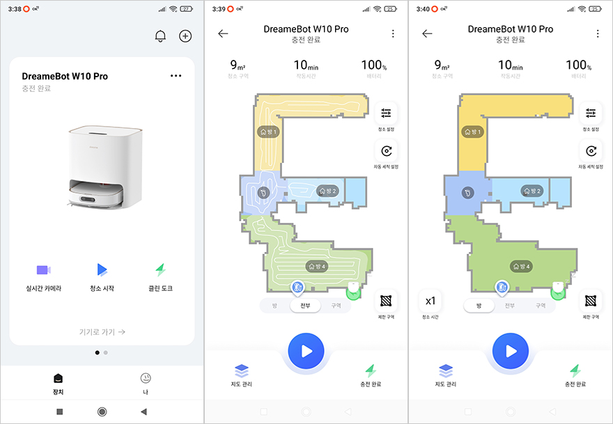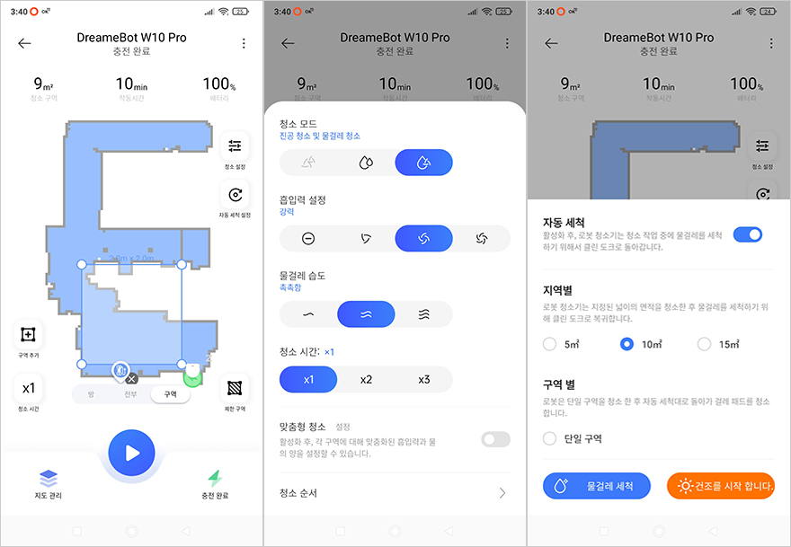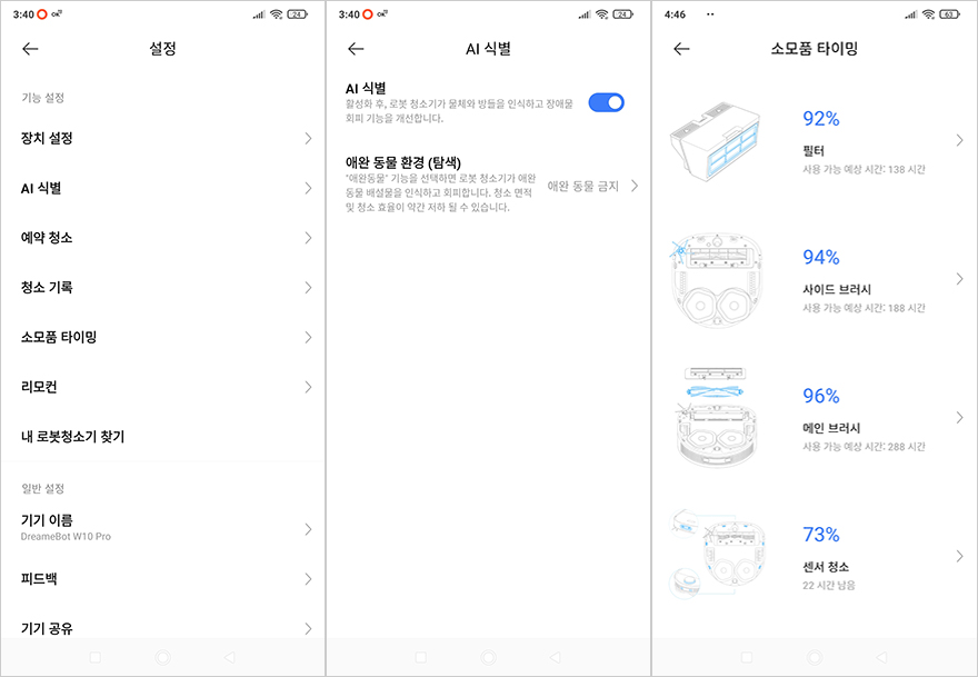 드리미 W10 Pro 로봇청소기는 출시 초기에는 샤오미의 미홈(Mi Home) 어플과 연동되었지만, 추후 드리미 자체 앱(App)이 나오면서 드리미 앱에서 모든 기능을 설정할 수 있습니다. 앱을 실행해 보면 연결된 W10 Pro 장치 화면을 메인으로 청소 구역 설정이라든지 청소 모드, 흡입력, 물걸레 속도, 자동세척 등 다양한 설정을 사용자가 환경에 맞춰서 설정할 수 있으며, 동물 감지나 먼지통 등 교체할 액세서리 제품들의 소모 상태도 알려줍니다. 물론, 구글 어시스턴트와도 연동이 가능하기 때문에 음성으로 작동시킬 수 있죠.