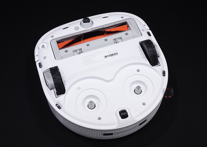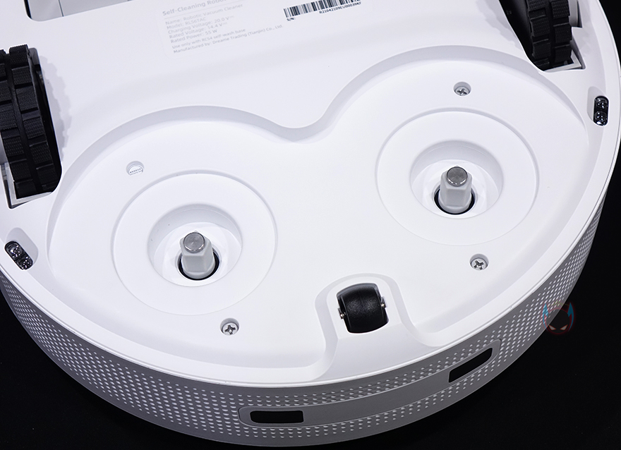 바닥 후면에는 물걸레 패드가 장착되는 자리로 물걸레 패드는 2개가 1쌍인 원형 패드로 자석방식으로 쉽게 탈부착할 수 있습니다. 참고로, 앞부분의 진공 흡입력은 4000Pa이며, 물걸레 패드는 1kg 압력으로 누르면서 회전식으로 닦습니다. 그리고, 로봇청소기의 내장배터리 용량은 6400mAh입니다.