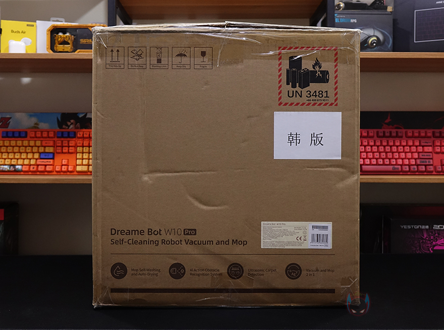 리뷰에 사용된 제품은 국내 정식 출시전 해외 본사로 받은 제품이기 때문에, 패키지에 차이가 있을 수 있습니다. 먼저 제품 박스부터 살펴보면, 요즘 로봇청소기 제품답게 박스 부피가 꽤 큽니다. 박스 디자인은 심플하게 전면에는 모델명과 제품 이미지정도만 담고 있으며, 박스 측면에 주요 특징으로 자동 걸레 세척 및 건조, AI 장애물 인식 시스템, 초음파 카펫 감지, 2-in-1 진공 및 걸레 청소를 표기해 놨습니다.