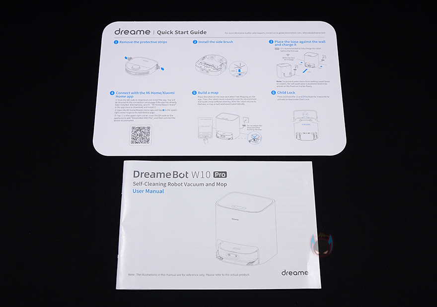 박스를 열어보면, 속박스로 한 번 더 포장된 패키지를 확인할 수 있으며, 속박스를 열어서 구성품을 확인해 보면 W10 Pro 로봇청소기, 물걸레 패드, 전원케이블, 사이드 브러시, 청소용 브러시를 기본적으로 꺼내서 확인할 수 있으며, 충전 및 세척 기능의 베이스 스테이션은 비닐 포장으로 구성품 중 가장 무겁습니다. 그리고, 제품 설명서 및 퀵-가이드도 제공해주고 있어서 사용 전에 참고하면 좋죠.