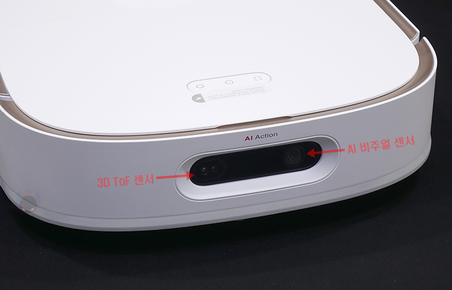 본격적으로 드리미(Dreame) W10 Pro 로봇청소기를 살펴보면, 로봇청소기 형태는 가장 흔히 볼 수 있는 전체 원형 디자인이 아닌 한쪽만 원형을 가지고 있습니다. 그러니깐 전면은 라운딩 사각 디자인이고, 후면이 반원 같은 디자인을 가지고 있죠. 전면을 라운딩 사각으로 적용한 이유는 원형 로봇청소기의 단점인 모서리 구역 청소를 제대로 할 수 없는 한계 부분을 개선하기 위해 적용된 겁니다. 여기에 전체적으로 화이트 색상에다가 포인트로 상단 테두리에 골드색상 라인을 적용하고 있습니다. 그리고, 전면에는 앞서 제품 박스에 주요 특징으로 표기했던 장애물 감지와 카펫 감지를 위해 AI 비주얼 센서(오른쪽)와 3D ToF 센서(왼쪽)가 탑재되어 있는데, 자동으로 감지하는 카메라 기능인만큼 한 번씩 청소를 해주는 게 기능 유지에도 좋습니다. 그리고, 왼쪽 측면에는 모서리를 감지할 수 있는 엣지 센서가 적용되어 있죠.