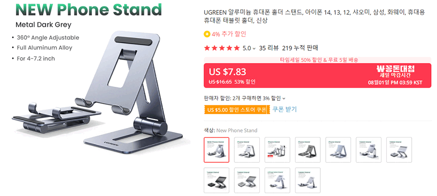제품을 살펴보기 전에 방금 언급했듯이 유그린에는 다양한 스마트폰/태블릿 PC 스탠드 제품들이 있습니다. 실제 유그린 알리익스프레스 공식스토어에 들어가보면 총 11가지 제품 옵션 중 소비자가 선택할 수 있는데, 스마트폰 크기에 맞는 전용 스탠드부터 태블릿 PC 경우에 따라선 노트북까지 받칠 수 있는 스탠드로 듀얼 시프트 제품까지 있죠.