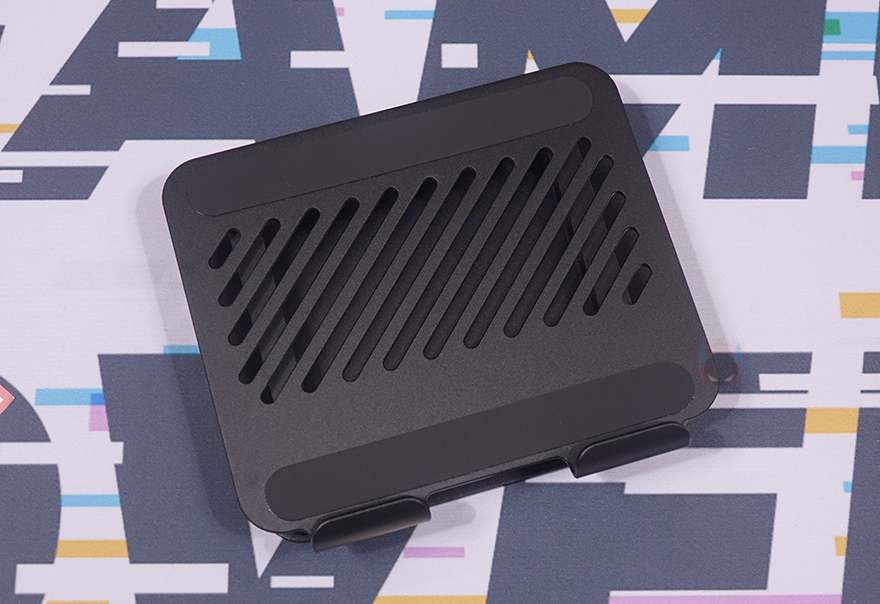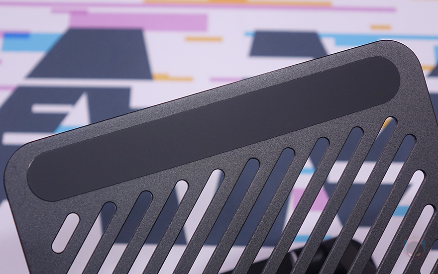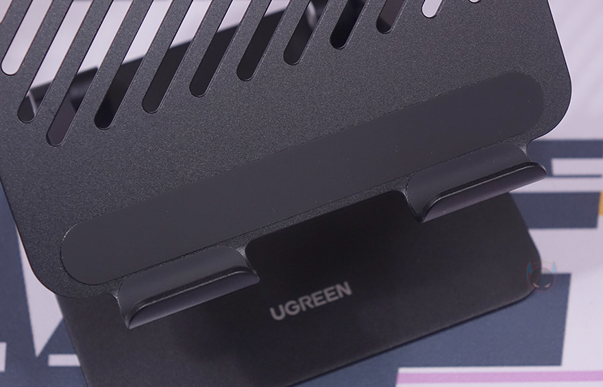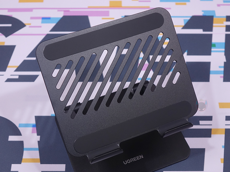 태블릿 PC를 받쳐주는 상판에는 미끄럼 방지를 위해 실리콘 패드가 위, 아래, 그리고 굴곡진 거치부분에도 기본 부착되어 있죠. 또한, 기기에서 발생하는 발열을 고려해 조금이라도 쿨링효과를 줄 수 있게, 가운데 면적에는 사선으로 에어홀 처리를 해놨습니다. 그리고, 스탠드를 받치는 아래 하판에는 로고를 새겨놨으며, 바닥과 접촉하는 밑바닥에도 미끄럼방지를 위해 모서리 부근마다 실리콘 패드를 부착해 놨죠.