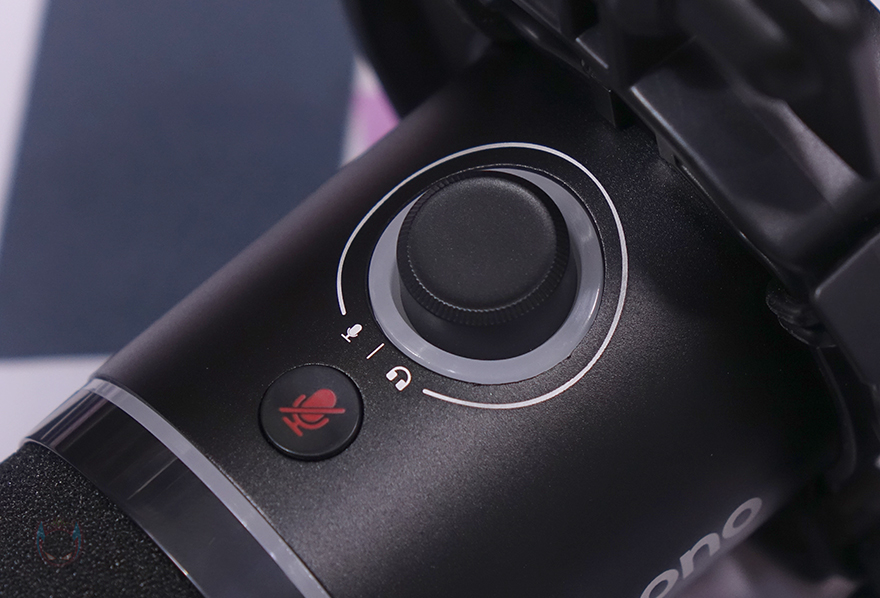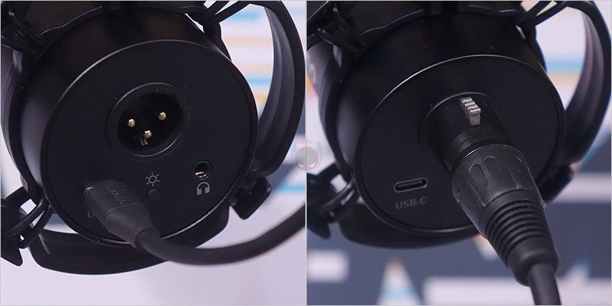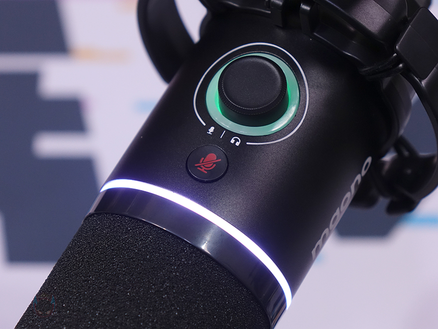 마이크 캡슐 아래 바디(Body) 부분은 메탈(Metal) 재질이며, 마이크 게인(Mic Gain)과 헤드폰 볼륨(Headphone Volume) 조절을 할 수 있는 2 in1 디지털 노브(Digital Knob)가 배치되어 있습니다. 그리고, 노브 바로 위에는 마이크 음소거(Mute)를 할 수 있는 버튼이 배치되어 있죠. 참고로, 노브 테두리 부분에는 마이크 게인과 헤드폰 연결에 따라 그린(Green)/블루(Blue) 2가지로 구분되며, 음소거 사용 시에는 레드(Red) 색상으로 보여줍니다. 바디 측면에는 maono 로고(logo)를 새겨놨으며, 마이크 후면에는 연결 포트 및 버튼이 배치되어 있는데, 앞서 언급했듯이 PD200X는 PD400X 마찬가지로 USB 연결과 XLR 연결 2가지 모두 갖추고 있으며, USB는 Type-C 포트형태이고, 바로 옆에는 RGB 스위치(Switch), 그리고 그 바로 옆에는 3.5mm 헤드폰 잭(Headphone Jack)이 배치되어 있습니다.