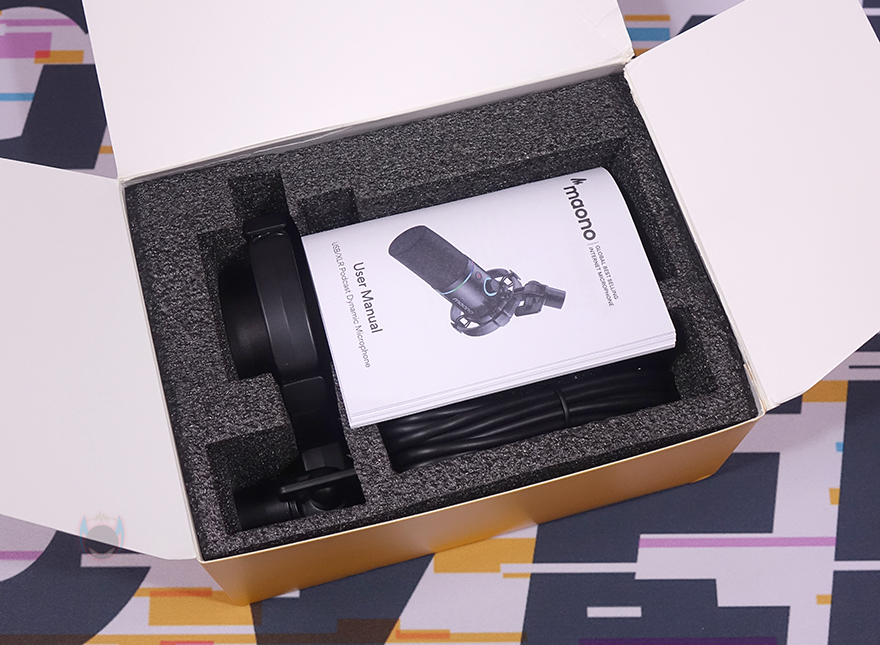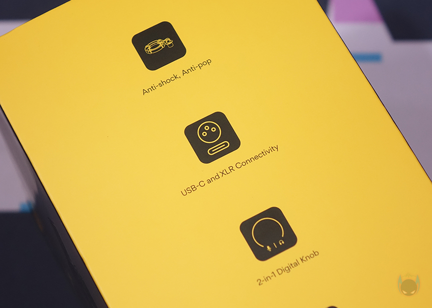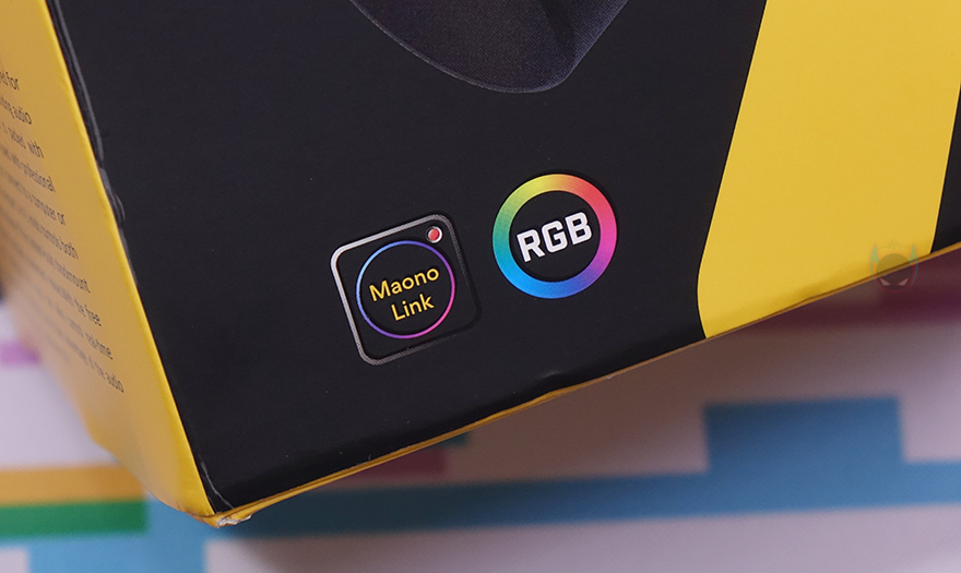 제품박스부터 살펴보면, 전면에는 모델명과 함께 제품 이미지를 확인할 수 있는데 마이크 이미지만 있는게 아니라 쇼크 마운트(Shock Mount)까지 함께 장착된 이미지를 볼 수 있습니다. 쉽게 말해, 마이크 붐 암(Boom Arm)에 사용할 수 있게 나온 제품이라는 거죠. 또한, 이미지 아래에는 마오노 어플인 마오노 링크(Maono Link)와 RGB 조명효과 적용 표기도 확인할 수 있습니다. 그리고, 박스 한쪽 측면에는 자사의 다른 마이크 제품들과 마찬가지로 해당 제품의 소개 문구를 담고 있으며, 반대쪽 측면에는 제품의 주요 특징으로 쇼크 마운트, USB-C/XLR 겸용 연결, 2-in-1 디지털 노브, RGB, 음소거 버튼을 표기해 놨습니다.