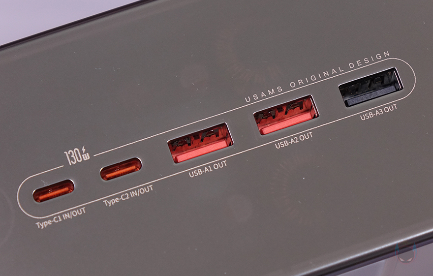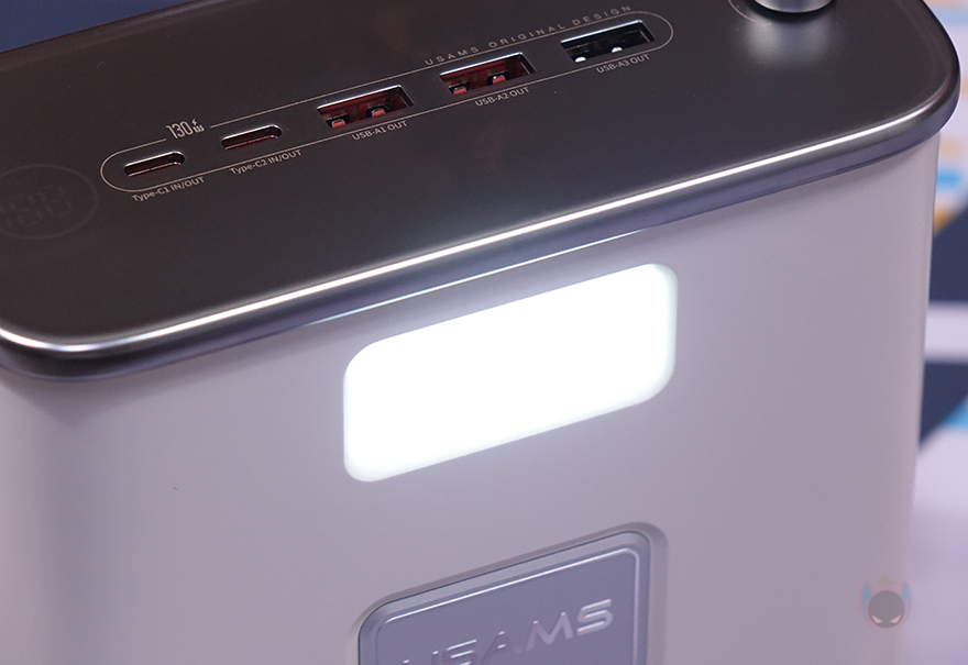 몸체 상단에는 총 5개의 USB 충전 포트와 1개의 노브(Knob)가 배치되어 있는데, 노브는 전원 On/Off와 라이트 밝기조절 기능을 가지고 있습니다. 노브를 버튼처럼 누르면 전원 On/Off가 되고, 돌리면 밝기조절이 되는 거죠. 그리고, 5개의 USB 충전포트는 2개가 Type-C, 3개가 Type-A 포트로 Type-C 포트는 입출력(Input/Output) 둘 다 지원하며, 단일(Single)로 사용했을 때 PD충전 지원으로 최대 100W까지 전력공급해 줍니다. 그리고, Type-A 포트는 모두 출력(Output) 포트로 A1/A2는 QC충전으로 단일 사용 시 22.5W 전력공급을 해주며, 나머지 A3는 10W 출력을 가졌습니다. 그리고, 포트 2개나 3개이상 사용시 Type-C 포트는 65W까지 입출력하며, Type-A는 A1/A2는 15까지, A3는 10W 그대로 유지를 합니다. 앞서 확인했듯이 몸체 후면에 사양표기를 해놨기때문에, 다중 포트 사용시 사용 전 참고하면 좋습니다.
