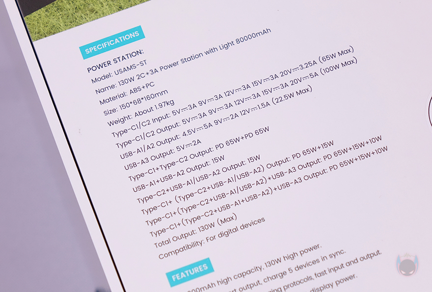 박스 후면에는 제품을 사용한 연출 이미지를 담고 있는데, 사실상 이 제품의 가장 큰 특징을 하나로 보여주는 부분입니다. 그리고, 이미지 아래에는 제품의 기본사양을 표기해 놨는데, 모델명(USAMS-ST)을 시작으로 재질, 크기, 무게, 각 USB 포트의 최대 전기 출력(Output)과 본 제품을 충전할 때 사용되는 포트의 진기 입력(Input) 전력값을 상세하게 표기해 놨습니다. 또한, 130W 출력은 총 포트의 전기 출력값이라고 표기해 놨죠. 그리고, 사양 표기 아래에는 다시 한번 주요 특징 문구를 확인할 수 있습니다.