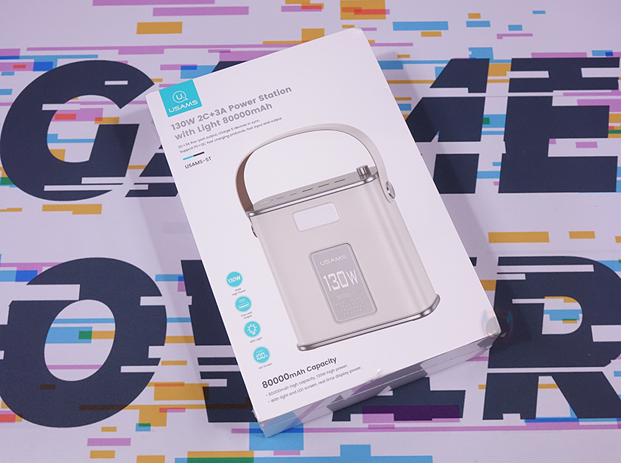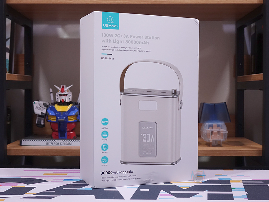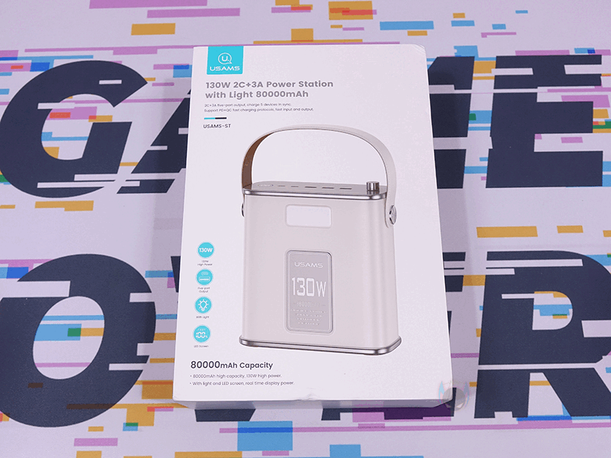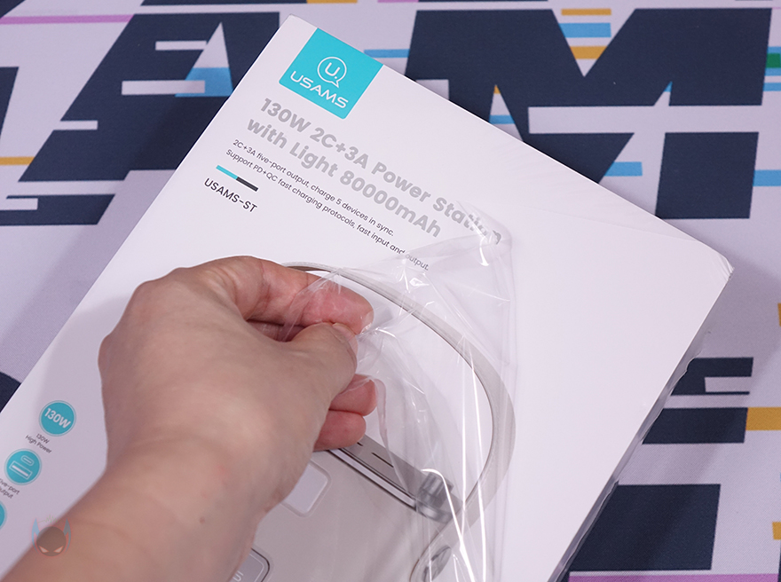 제품 박스부터 살펴보면, 박스 전체 비닐 밀봉처리가 되어 있어서 소비자입장에선 판매제품에 신뢰를 가질 수 있습니다. 박스 전면에는 모델명과 함께 제품 이미지를 확인할 수 있는데, 뒤에서 다시 언급하겠지만, USAMS-ST는 화이트(White)/블랙(Black) 2가지 색상으로 나왔으며, 모델명은 작게 표기하면서 위에 제품이름은 '130W 2C+3A Power Station with Light 80000mAh'로 상당히 깁니다. 그리고, 그 아래 특징 문구로 총 5 포트(Port)와 PD+QC 충전 둘 다 지원한다는 문구도 표기해놨죠. 물론, 제품 이미지 한쪽 아래에도 주요 특징에 반복 문구와 라이트(Light) 기능과 LED 스크린(Screen) 기능을 추가로 표기해 놨습니다.