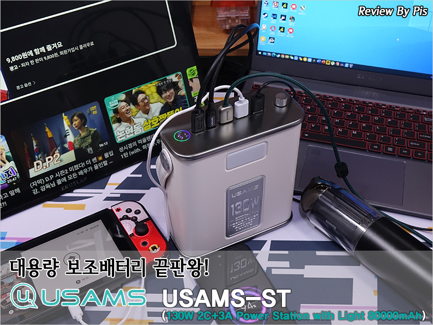 USAMS-ST 보조배터리 파워스테이션은 최대 장점은 대용량 배터리와 고속충전, 그리고 포트가 5개 존재한다는 점이죠. 실제로 100W 고속충전이 가능하기 때문에 PD충전 지원의 노트북(Notebook) 충전은 물론 동시에 스마트폰 충전도 기본으로 할 수 있습니다. 그리고, 요즘은 닌텐도스위치(nintendo switch) 같은 휴대용 콘솔게임기 사용자도 많은데, 이런 휴대용 콘솔게임기도 USAMS-ST만 있으면 배터리 걱정이 없습니다. 특히, 야외 캠핑 같은 곳에서 아이들을 위해 게임환경을 만들어주기에도 부족함이 없죠. 실제로 휴대용 모니터(Monitor)와 게임기 충전기까지 연결하고, 스마트폰까지 충전하는데 USAMS-ST 하나면 충분합니다.