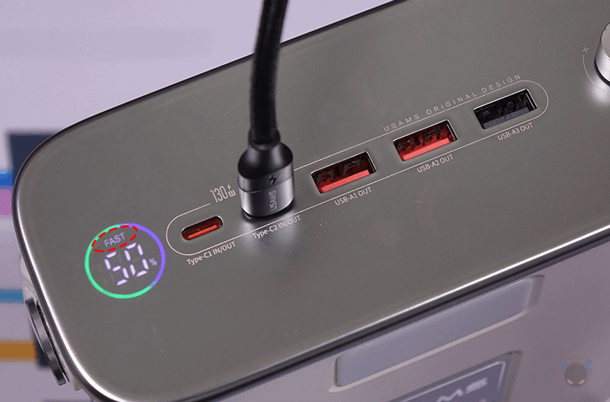 직접, USAMS(유삼스) 130W 80,000mAh 보조배터리 USAMS-ST를 사용해 보면, 작동법은 간단합니다. 앞서 언급했듯이 노브(Knob)를 한번 누르면 전원이 켜지고, 다시 한 번 누르면 꺼지죠. 그리고, 전원이 켜지면 USB Type-C 포트 왼쪽에 배터리 잔량을 표시해 주는 LED 스크린(Screen)이 함께 켜집니다. 참고로, LED 스크린은 5초 이상 포트 연결이 없으면 자동으로 전원과 함께 꺼집니다. 그리고, USB Type-C1/C2포트와 A1/A2 포트는 고속충전이라 연결 시 LED 스크린에 'Fast'라고 표기되어 있죠. 또한, 노브를 연속 두 번 누르게 되면 라이트(Light) 기능이 켜지고, 반대로 다시 연속 두 번 누르면 끌 수 있으며, 시계 방향으로 돌리면 밝기가 증가하고, 반대방향으로 돌리면 감소합니다. 참고로, 배터리 전원과 라이크 기능은 따로 작동하기 때문에,, 전원 On/Off와 별개로 라이트 기능만 On/Off 해서 사용할 수 있습니다.
