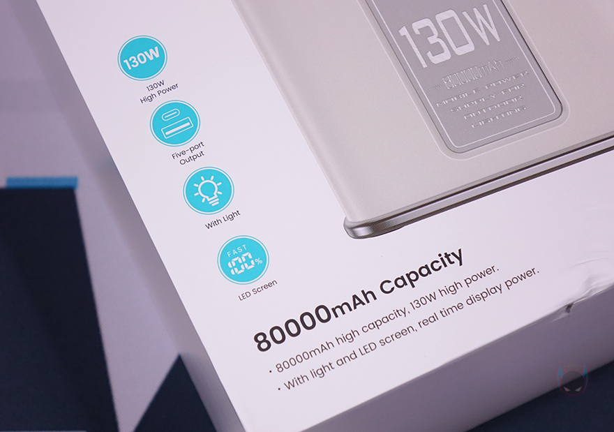 배터리가 내장되어 있는 몸체(Body) 케이스는 ABS와 PC(폴리카보네이트) 소재를 사용했으며, 전면(Front)에는 최대 전기 출력 130W와 80,000mAh 용량을 별도의 네임플레이트를 부착해 고급스럽게 표기해 놨습니다. 그리고, 윗부분에는 이 제품의 충전 외에 또 다른 기능인 라이트(Light) 기능을 적용해 놨는데, 몸체 후면에도 같은 위치로 적용해 앞뒤로 각각 라이트 기능이 작동됩니다. 그리고, 후면 아래에는 사양 표기를 해놔서, 사용하기 전에 각 포트의 전기 출력과 입력값을 알아둘 수 있죠.