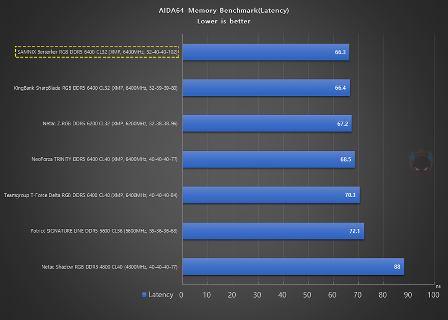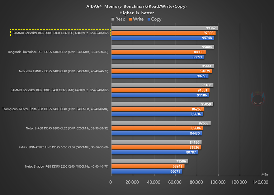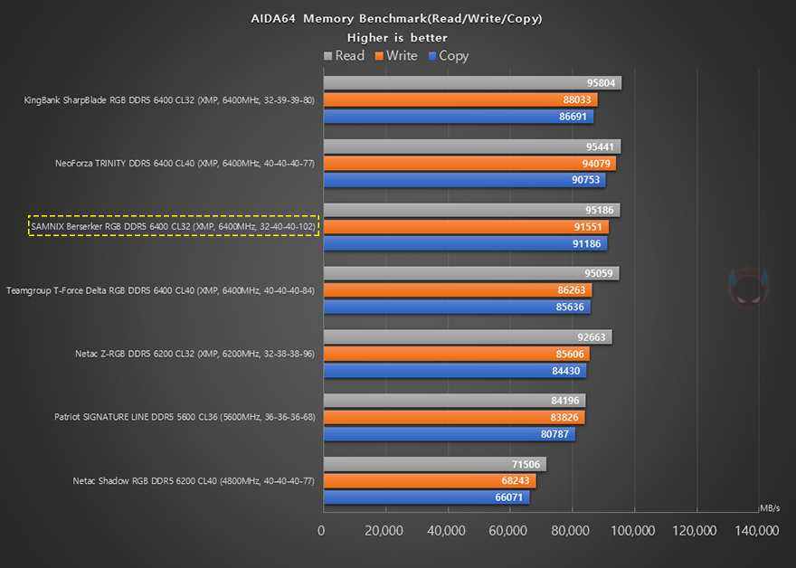 그럼, XMP 프로파일이 적용된 상태에서 Berserker RGB DDR5 메모리 성능을 확인해 보면, 가장 기본이 되는 AIDA64의 Memory Benchmark를 통해서는 동일한 다른 6400MHz 제품들과 비슷한 결과를 보여줍니다. 대역폭에선 일부 차이가 있지만, 레이턴시(Latency)에선 가장 짧은 속도를 보여주죠. 그리고, Passmark의 PerformaceTest를 통해서는 비교 제품들 중 가장 큰 64GB 용량을 가지고 있어서 동일한 클럭의 제품들보다 좀 더 높은 점수 결과를 보여줍니다. 전체 시스템 성능으로 보는 PCMark10에서는 비슷한 결과가 나왔죠.