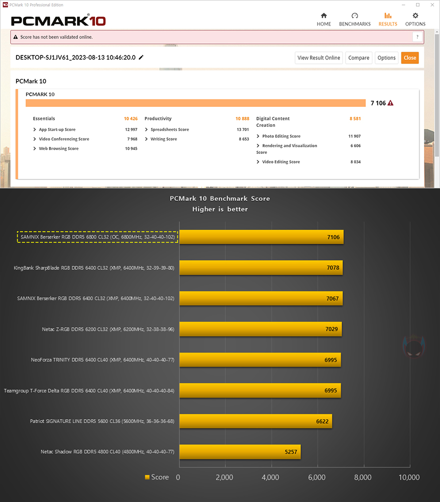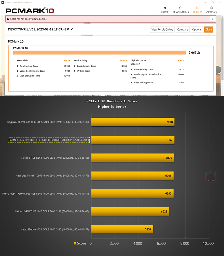 Berserker RGB DDR5 메모리는 비교 제품들 중 유일하게 64GB 용량을 가졌습니다. 메모리 용량이 클수록 가장 영향이 미치는 작업 중 하나는 바로 이미지와 비디오 편집 작업으로 이미지과 비디오 편집 작업 프로그램으로 유명한 어도비 포토샵(Adobe Photoshop)과 프리미어 프로(Premiere Pro)로 벤치마크할 수 있는 Procyon에선 확실히 용량에서 유리한 성능차이를 결괏값으로 보여줍니다.