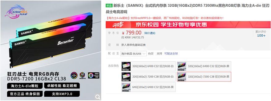 2018년에 설립된 중국의 메모리 전문업체 SAMNIX(삼닉스)는 자사의 가장 대표적인 라인업 Berserker series에 DDR5에 RGB를 적용한 Berserker RGB DDR5 메모리를 선보였습니다. 물론, 요즘 DDR5에서 가장 핫한 SK 하이닉스(Hynix) 칩을 사용했죠. 그중에서도 하이닉스 A다이(A-Die)를 적용한 제품들에서 현재 유일하게 64GB(32GBx2) 용량으로 판매되고 있는 6400MHz 모델은 대용량 제품임에도 역시 하이닉스 A다이 칩이 적용되어서 64GB 듀얼 키트 메모리가 끌어낼 수 있는 최대 클럭까지 오버클럭할 수 있어서 XMP 프로파일로도 만족스럽지만 대용량과 함께 더 높은 성능을 원하는 소비자에겐 최고의 선택이 될 수 있는 메모리입니다. 여기에, RGB Sync도 완벽하게 지원하죠. 물론, 아직 중국시장에서만 활동하고 있다는 점에 구매에 제한이 좀 있을 수 있지만, 요즘 해외직구를 이용하는 소비자들이 많은 만큼 해외직구를 통해서라도 대용량 하이닉스 A다이 칩이 적용된 RGB DDR5를 원한다면, SAMNIX Berserker RGB DDR5를 추천합니다.