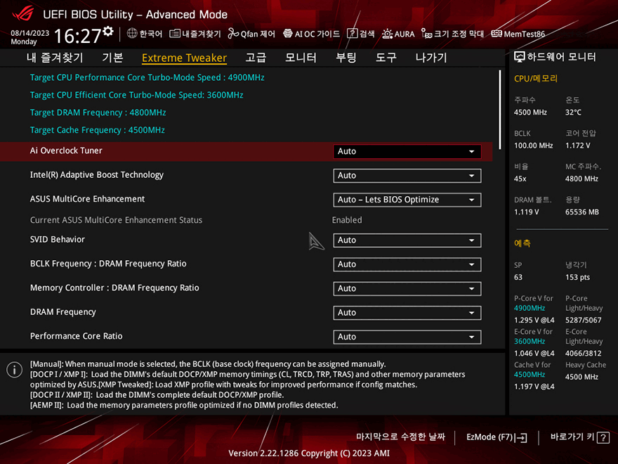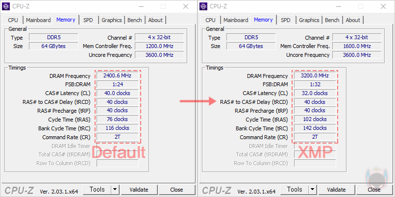 이제, Berserker(버서커) RGB DDR5 메모리의 성능을 확인해 보는데, 리뷰에 사용된 모델은 6400MHz 64GB(32GBx2) 모델로 앞서 잠깐 언급했듯이 유일하게 64GB 용량입니다. 그리고, 램타이밍(Ram Timing)도 가장 낮은 CL32죠. 또한, 인텔 XMP 프로파일도 적용되었습니다. 그래서, 기본 장착한 상태에선 4800MHZ으로 작동하지만, 메인보드 CMOS에서 XMP 프로파일값을 불러와 적용하면 손쉽게 6400MHz 클럭으로 오버클럭 사용할 수 있습니다.
