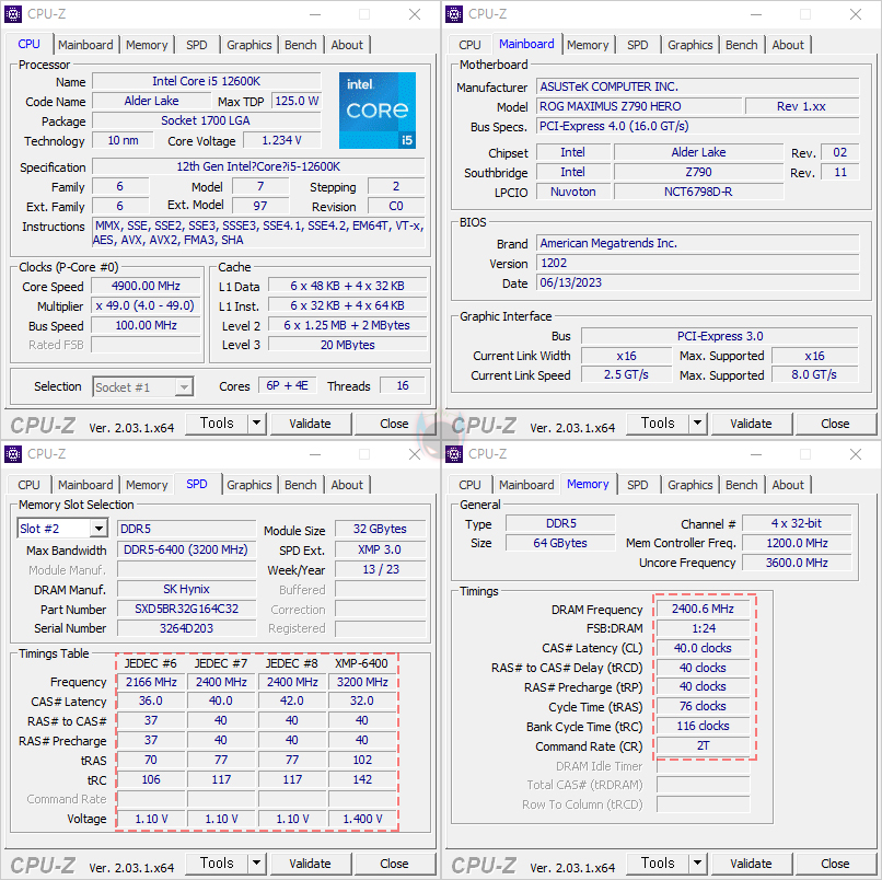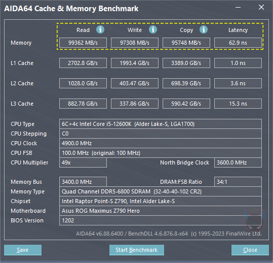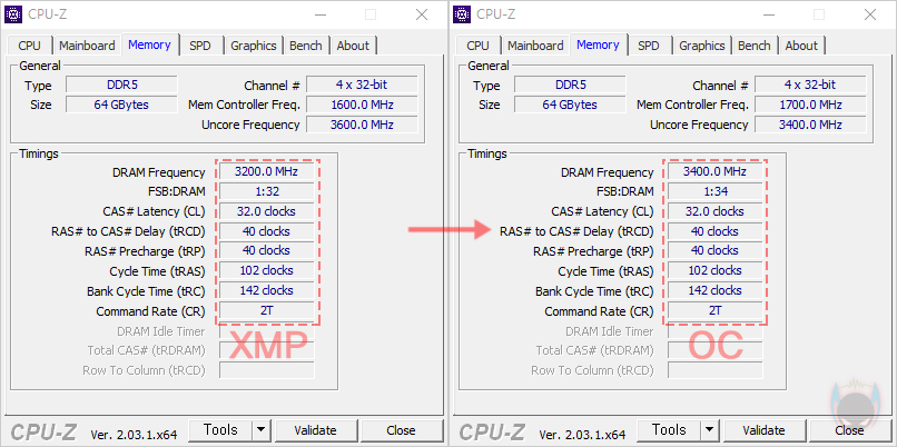 앞서, Berserker RGB DDR5 메모리에는 클럭에 따라 SK 하이닉스 M다이(M-Die)와 A다이(A-Die) 칩이 사용된다고 언급하면서, A다이는 6400MHz 클럭부터 적용된다고 했습니다. 그래서, 리뷰에 사용된 6400MHz 64GB 모델은 하이닉스 A다이(Hynix A-Die)가 적용되어서, 수동으로 추가 오버클럭을 해봤습니다. 추가 오버클럭 결과 6800MHz 클럭까지 더 올릴 수 있었는데, 이는 현재 64GB(32GBx2) 듀얼 키트(Dual Kit) 메모리 제품군에선 가장 높은 오버클럭으로, 대부분의 경쟁사들이 64GB(32GBx2) 제품의 클럭을 6600MHz XMP 프로파일로 내놓는 경우가 현재 한계입니다. 눈에 띄는 점은 XMP 프로파일의 전압과 램타이밍값을 그대로 유지한 상태로 6800MHz까지 올라갈 수 있다라는 점이죠. 물론, 1.4V이상으로 전압을 더 주면 클럭이 올라가겠지만, 그만큼 메모리에 쿨링시스템도 갖춰야하는 부담감이 있습니다.