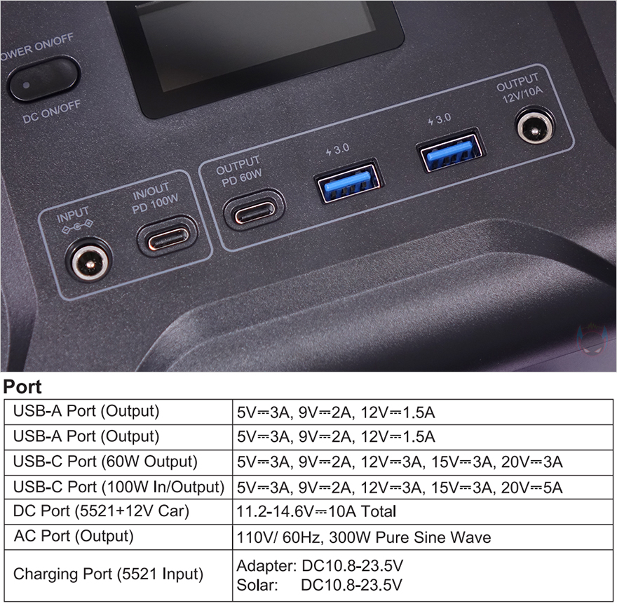 또한, 디스플레이 아래에 배치된 포트 같은경우에는 맨 왼쪽에 입력(Input) 즉 충전 포트(Charging Port)로 하나는 제공되는 AC 어댑터와 태양광(Solar) 패널 사용 시 이용되는 PV to DC 케이블과 연결되는 포트이며, 바로 오른쪽에는 USB Type-C 포트로 역시 제공되는 PD 100W 케이블을 사용해서 충전할 때 연결됩니다. 쉽게 구분할 수 있게 표기도 되어 있죠. 그리고, 나머지 포트들은 출력(Output) 포트로 USB Type-C 포트는 최대 60W까지 지원하며, 나머지 USB 3.0 Type-A 포트 2개는 18W, 그리고 맨 오른쪽에 배치된 포트는 AC 포트로 300W까지 출력합니다.