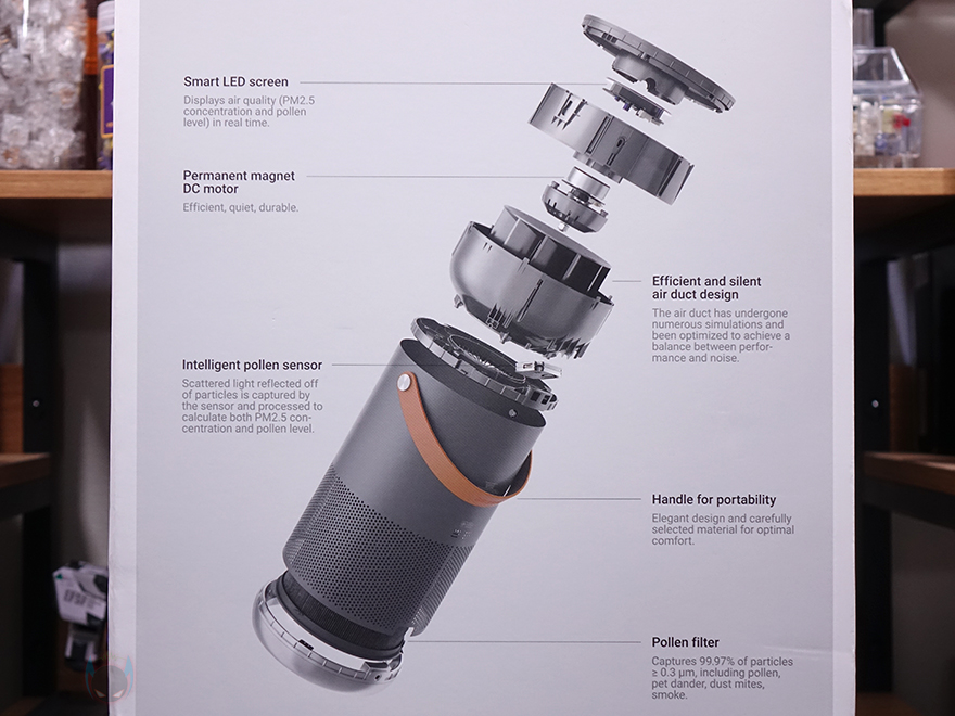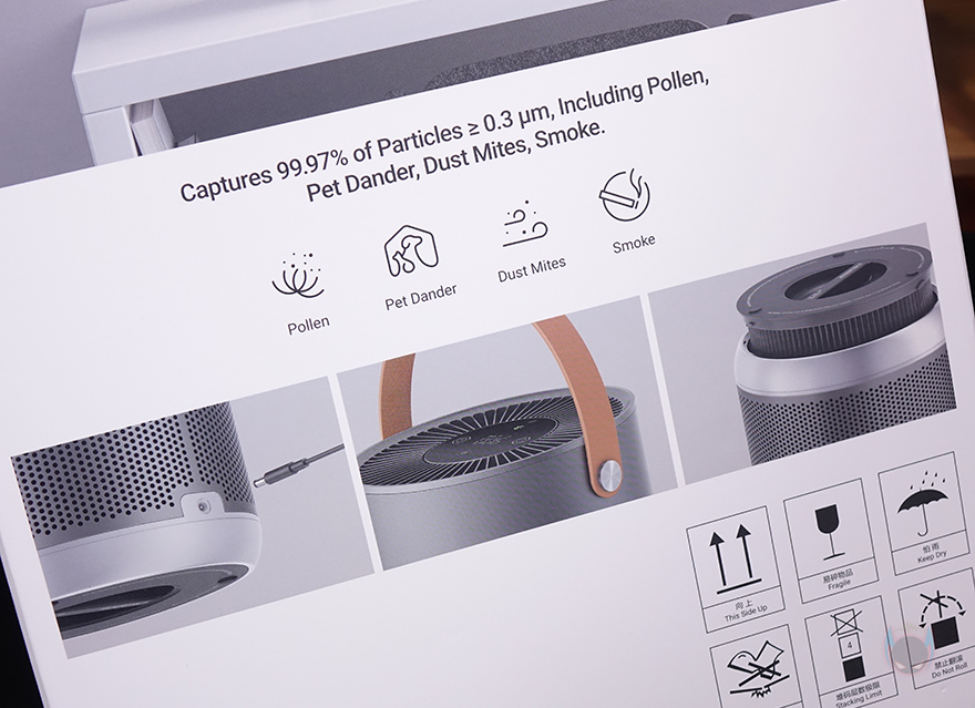 그리고, 박스 양쪽 측면에는 제품의 주요 특징을 소개하는데, 한쪽 측면에는 0.3μm(마이크로미터) 입자까지 99.97% 정화율, 꽃가루(Pollen), 애완동물 비듬(Pet Dander), 먼지 진드기(Dust Mites), 연기(Smoke) 정화를 표시해놨습니다. 쉽게 말하자면, PM10 입자와 PM2.5까지 정화한다는 거죠. 그리고, 아래에는 간편한 연결, 이동식 손잡이, 손쉬운 필터교체를 이미지로 언급하고 있습니다. 반대쪽 측면에는 분해 및 내부 구조 이미지를 담으면서 좀 더 자세하게 제품 특징을 설명해주고 있죠.