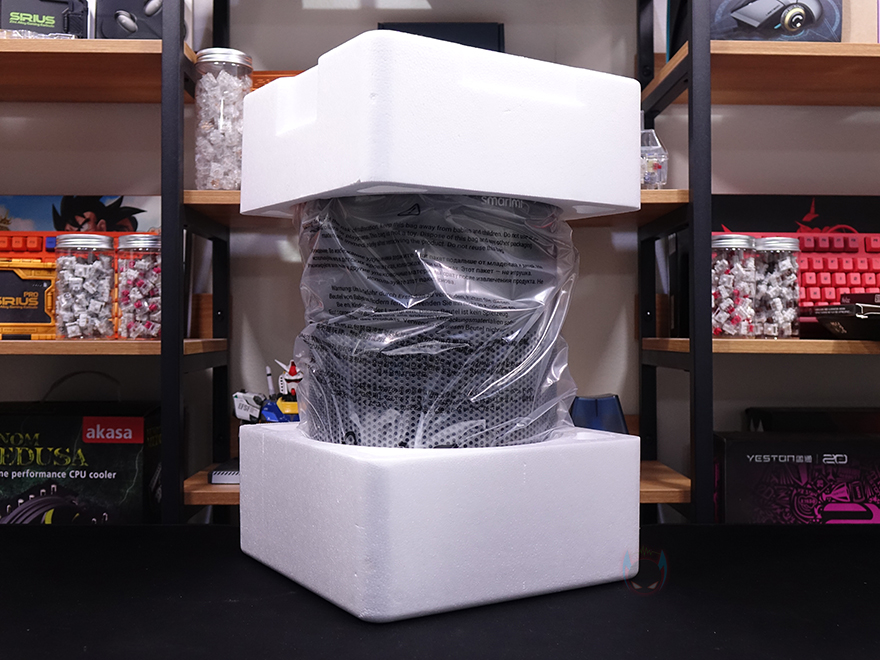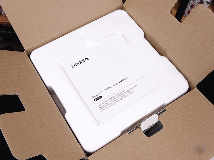 박스 상단에는 이동시 편의를 위한 손잡이가 있으며, 박스를 열어보면, 외부 충격방지를 위한 스티로폼 포장재와 함께 P1 공기청정기는 비닐 포장되어 있습니다. 그리고, 전원 코드는 정전기방지 보호비닐이 따로 포장되어 있으며, 제품 구성은 P1 공기청정기, 전원코드, 제품설명서로 간단합니다.