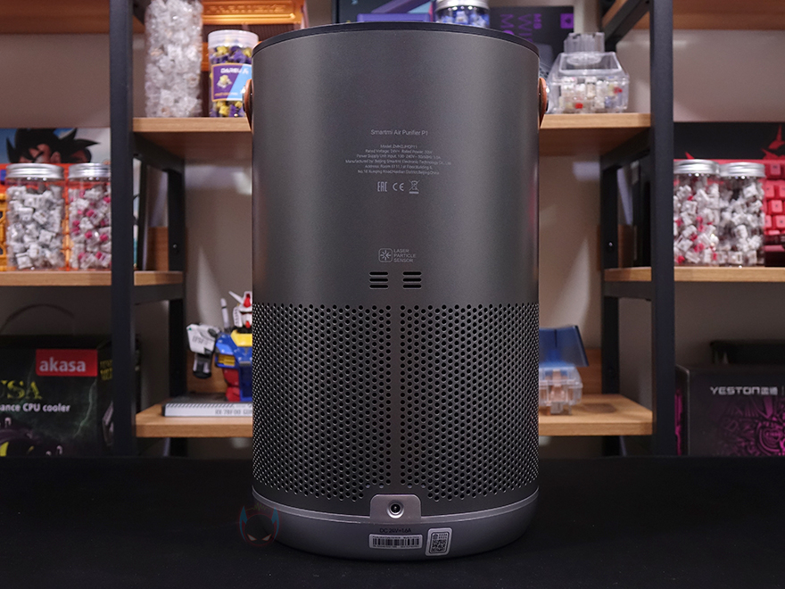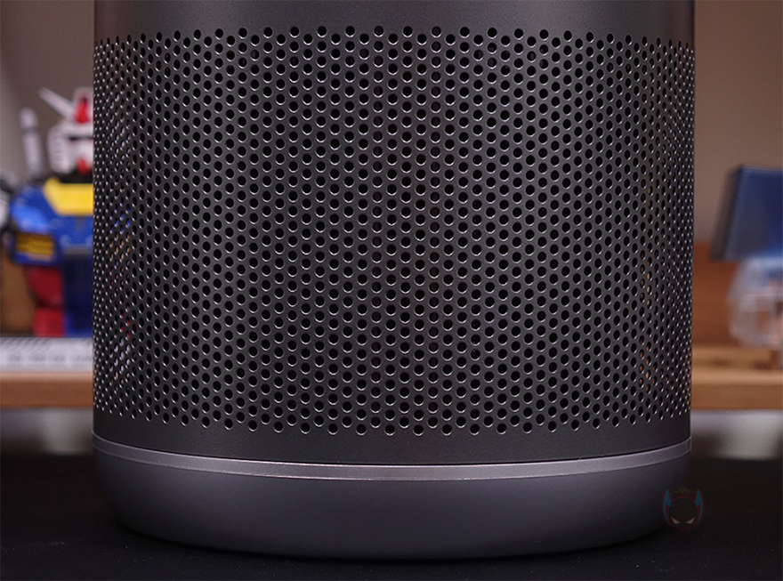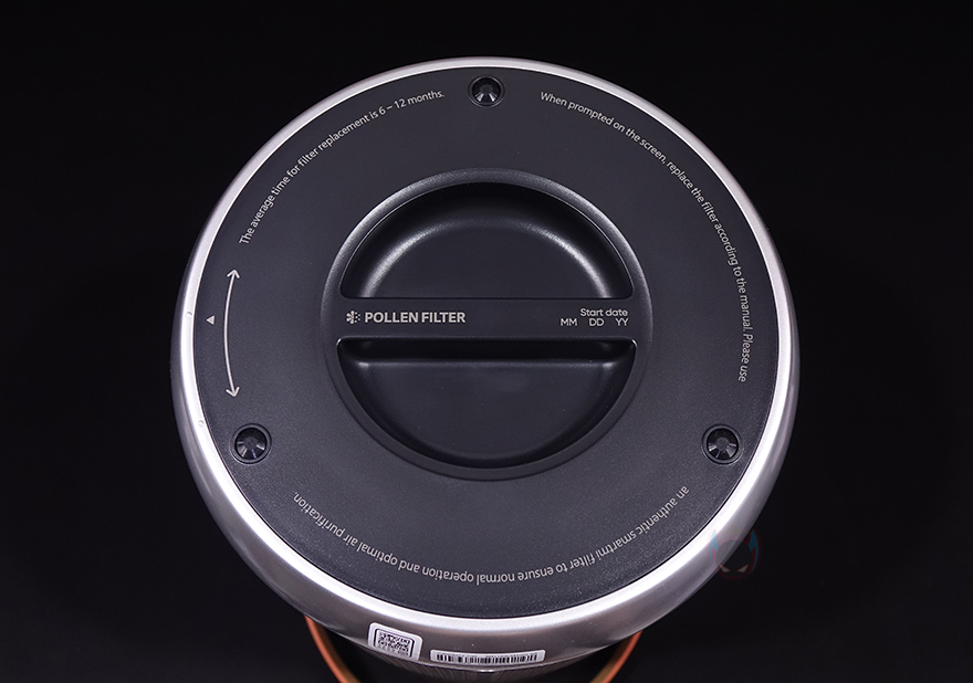 제품을 좀 더 자세히 살펴보면, 전면 윗부분에는 심플하게 로고(Logo)만 새겨놨으며, 아랫부분에는 외부 공기를 흡입하도록 에어홀 처리가 되어 있습니다. 물론, 원통형 디자인이기 때문에 360˚로 디자인이 동일하죠. 그래서, 후면 디자인도 동일한데, 대신 후면에는 로고와 같은 위치에는 모델명과 소비전력 등을 표기해 놨으며, 아래에는 공기 중 오염물질을 감지하는 레이저 센서(Laser Particle Sensor)가 배치되어 있습니다. 그리고, 맨 아래에는 전원코드와 연결되는 포트가 배치되어 있는데, 바로 옆에 애플 홈(Apple Home)과 연동되도록 QR코드 스티커도 부착되어 있죠.