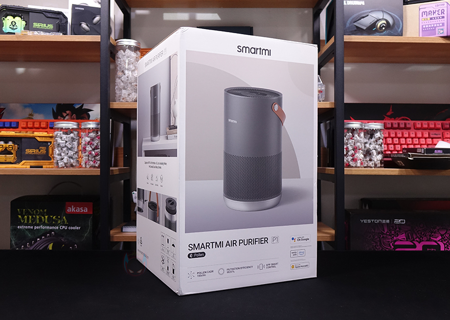 제품 패키지는 박스형태로 소형 공기청정기 제품답게 박스가 큰 편은 아닙니다. 쉽게 말해, 거실용 공기청정기보다는 작은 규모라는거죠. 박스 전후면에는 제품 이미지를 담고 있는데, 한눈에 봐도 거실보다는 방에 놓고 사용하는 소형 가전이라는 걸 짐작할 수 있습니다. 그리고, 시작에서도 잠깐 언급했듯이 스마트미 제품들이 출시한 지 좀 되어도 꾸준히 인기를 받는 건 어플 연동이 완벽하기 때문인데, P1 공기청정기 역시 모델명 옆에 구글(Google)/아마존(Amazon)/애플(Apple) 연동 지원이 표기되어 있죠. 물론, 자체 어플도 지원하고 있습니다.