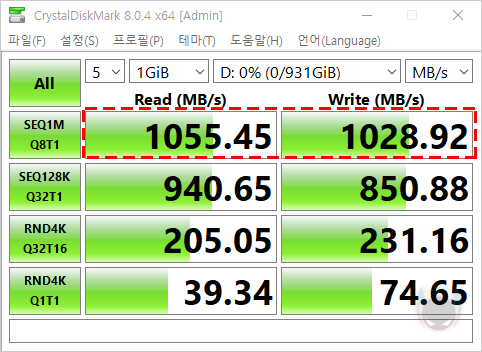 오리코 M.2 NVMe SSD 외장 케이스에 SSD를 장착했다면, 속도확인을 해봐야겠죠. 제공되는 USB Type-C to C 케이블을 케이스와 PC 또는 노트북에 연결하면 되는데, 케이블 길이는 30cm입니다. 그리고, 오리코 M.2 NVMe SSD 외장 케이스 같은경우에는 앞서 제품 사양표기에서 확인했듯이 전송속도가 10Gbps입니다. 물론, 이건 이론상의 속도이고, 10Gbps면 실제 최대 속도는 1000MB/s가 나오죠. 그래서, SSD를 장착한 오리코 M.2 NVMe SSD 외장 케이스를 CrystalDiskMark에서 실행해 본 결과, 1000MB/s의 읽기(Read)/쓰기(Write) 속도가 나오는걸 확인할 수 있습니다. 물론, 이런 속도가 나오기 위해선 SSD도 최소 1000MB/s 속도가 나오는 제품 이어야 하고, PC/노트북의 USB 포트 규격인 최소 USB 3.1 규격이어야 합니다.