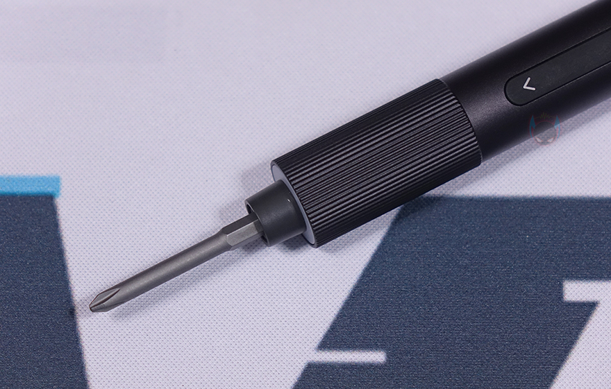 케이스 수납 공간 마지막으로 힌지(Hinge) 부분에 수납되는 무선 전동드라이버는 앞서 확인한 작은 드라이버 비트가 사용되는 정밀 드라이버입니다. 물론, 이미 HOTO(호토)에서 정밀 드라이버를 선보인 제품들이 있지만, 이번 정밀 드라이버 키트 프로(Precision Screwdriver Kit Pro)에 담긴 정밀 드라이버는 기존 제품과 달리 1, 2단 기어(Gear) 토크 속도조절이 가능합니다. 그리고, ∧ 버튼을 누르면 나사를 조이고, ∨ 버튼을 누르면 나사를 푸는 단순한 작동방식이라 전자 제품의 소형 나사를 풀 때 매우 편리하죠. 또한, 드라이버 뒤쪽에는 케이스 충전 단자와 접촉하는 접지와 충전상태를 확인할 수 있는 LED 인디케이터가 적용되어 있으며, 앞쪽에는 드라이버 비트가 들어가는 구멍과 사용 시 자동으로 켜지는 LED가 적용되어 있습니다.