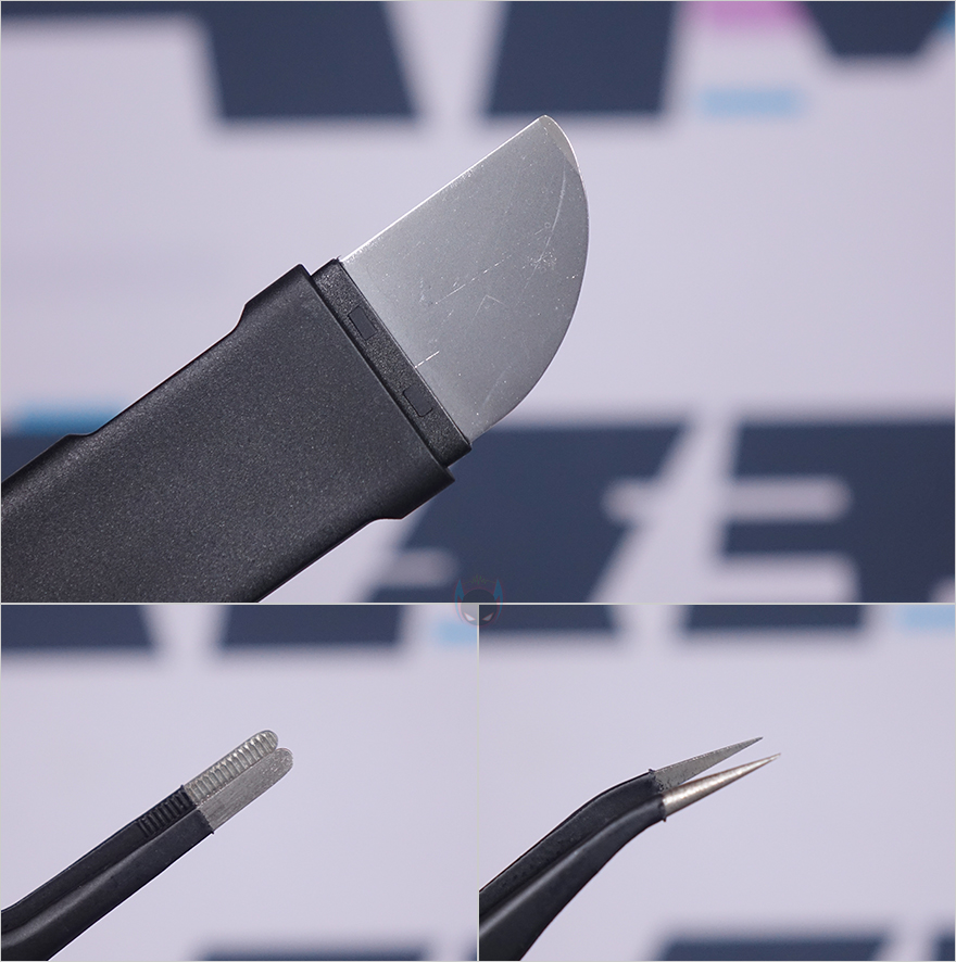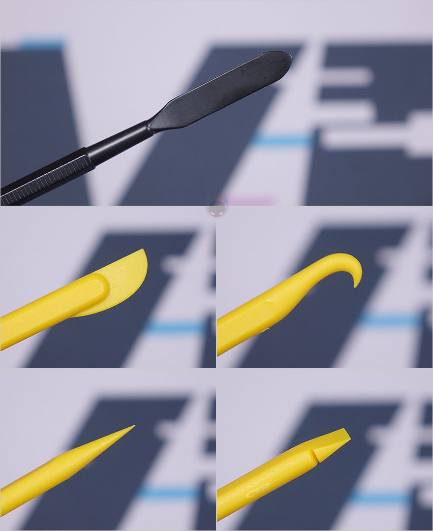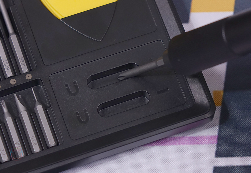 케이스에 수납된 구간별로 하나씩 살펴보면, 일단 하판에 수납되는 도구들은 드라이버 비트와 플라스틱 스퍼저(Spudger), 오프닝 픽(Opening Pick)이 수납되어 있는데, 드라이버 비트는 28mm와 45mm 길이로 28mm 비트 20개, 45mm 비트 6개 총 26개가 기본 제공됩니다. 굵기는 다른 정밀 드라이버에 많이 사용되는 C4입니다. 그리고, 긁거나 이음새를 열 때 사용되는 플라스틱 스퍼저는 양쪽 끝이 곡선형으로 3개가 제공되며, 역시 이음새를 열 때 사용되는 오프닝 픽(Opening Pick)은 5개가 제공됩니다. 그리고, 오프닝 픽이 수납되는 아래 공간에는 자석 모양으로 +/- 구분의 홈이 2개 있는데, 바로 드라이버 비트에 자성이 생기도록 해주는 자화기(Magnetizer) 공간입니다.