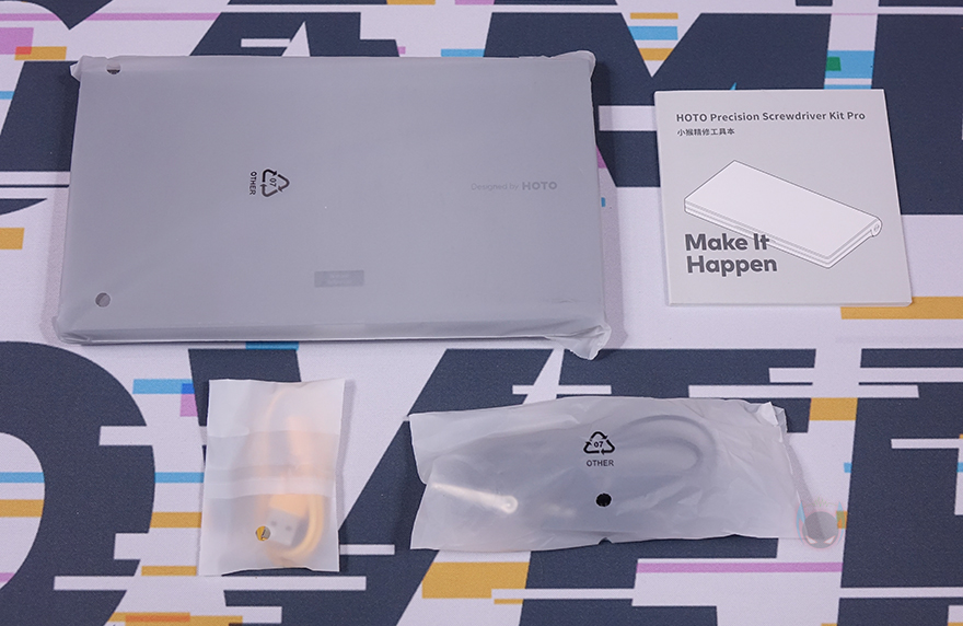 포장 박스를 열어보면, 제품 구성품들은 설명서를 제외하고 모두 비닐 포장처리되어 있으며, 제품 구성은 도구들이 들어있는 정밀 드라이버 키트 프로 케이스, 제품 설명서, 충전케이블, 정전기방지 손목 스트랩으로 이루어져 있습니다.