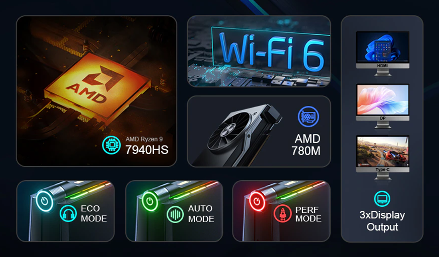 이 외에도 라이젠 9 7940HS APU에는 라데온 780M이 탑재되었는데, 현재 내장그래픽 중 가장 좋은 성능으로 지포스 1650급으로 평가받고 있다. 또한, 이번 7940HS 미니PC에는 Wi-Fi 6 탑재와 NVMe SSD, 2.5인치 저장장치를 장착할 수 있으며, 메모리는 DDR5로 최대 64GB용량까지 지원한다. 이 밖에 CHATREEY AMD 라이젠 기반 게이밍 미니PC는 예전부터 3가지 모드(ECO, AUTO, Performanc)를 갖춰 소비자가 쉽게 성능조절을 할 수 있게 해주며, 4K 모니터를 최대 3대까지 연결할 수 있고, 전면에 USB 4.0 지원의 타입C 포트를 배치하고 있다. 현재 CHATREEY 7940HS 미니PC는 알리익스프레스 공식 스토어에서 구입할 수 있다.