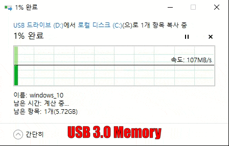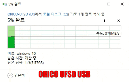 그리고, 시작에서 언급했듯이 UFSD USB는 USB 메모리처럼 휴대성을 강조하면서, 빠른 속도를 가진 것이 특징이라고 했고, 실제 USB 메모리 크기와도 비슷한 걸 확인했습니다. 그래서, 실제 10GB 용량의 파일을 UFSD USB와 USB 3.0 메모리에 각각 보내는 실제 전송속도를 확인해 봤는데, UFSD USB가 약 3배 이상정도 빠른 것을 확인할 수 있습니다. 그리고, 속도저하도 없죠. 정확히는 SATA 방식의 SSD 속도수준급에 가깝습니다.