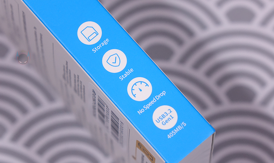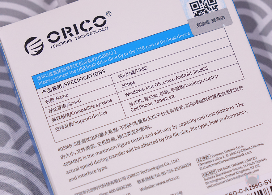 제품 패키지는 박스형태로 오리코의 대부분의 제품들은 박스포장까지 밀봉으로 처리하는 경우가 많죠. 그래서, 소비자입장에선 좀 더 판매 제품에 신뢰를 가질 수 있습니다. 박스 전면에는 제품 이미지와 함께 제품의 컨셉 문구로 'High Speed Solid State Performance'라고 표기하면서, 용량과 USB 3.2 Gen1 규격 표시를 함께 확인할 수 있습니다. 그리고, 아래에는 저장(Storage), 안정(Stable), 속도저하 없음(No Speed Drop), 405MB/s 스펙상의 속도 표기를 해놨죠. 이는 박스 측면에도 동일하게 한 번 더 표기해 놨으며, 박스 후면에는 운영체제 지원과 기기 호환성 표기를 해놨습니다.