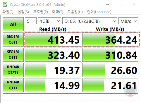 직접, 오리코(Orico) UFSD USB를 사용해 보면, 일단 UFSD USB의 스펙상의 속도는 상품정보에서 읽기(Read) 411Mb/s, 쓰기(Write) 353MB/s로 명시하고 있습니다. 실제 저장장치 제품들이 스펙상으로 속도측정을 많이 사용하는 CrystalDiskMark를 통해 속도측정해 보면 스펙상의 속도로 나오는 걸 확인할 수 있죠.