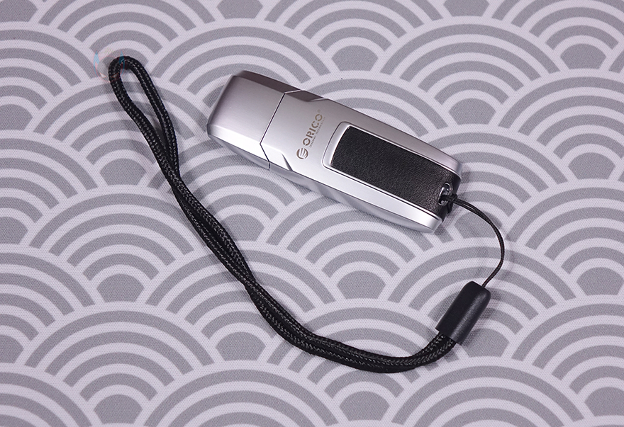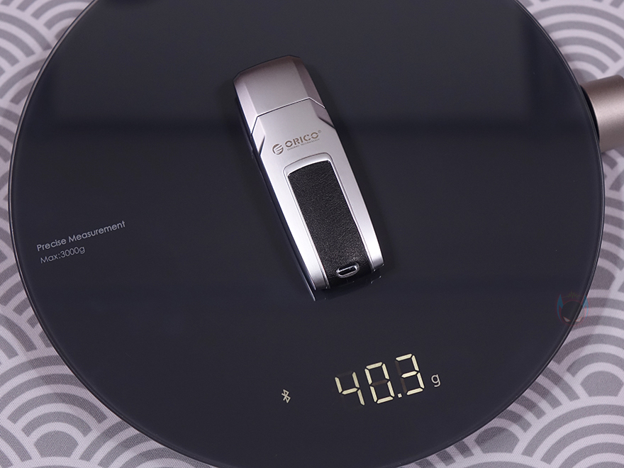 그럼, 오리코(Orico) UFSD USB를 살펴보는데, 한눈에 봐도 디자인이 USB 메모리와 유사하다라는걸 알 수 있습니다. 실제로 USB 메모리와 크기를 비교해 봐도 큰 차이가 없죠. 참고로, UFSD USB 사이즈(Size)는 68.3x22.8x12.5mm입니다. 그리고, 앞뒤로는 ORICO 로고(logo)와 UFSD 표기를 해놨으며, 무게는 약 40g으로 일반 USB 메모리보다 좀 더 무거운데, 이유는 케이스 재질이 금속이기 때문입니다.
