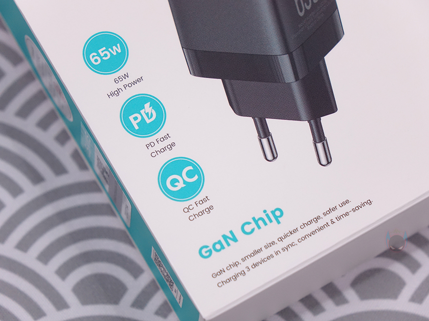 박스 전면에는 제품 이미지 외에도 3포트 GaN(질화갈륨) 고속충전기라는 문구를 표기해놨는데, 대부분 65W이상부터는 GaN 방식을 적용하고 있습니다. 그리고, 제품 이미지 측면에도 65W 고속출력, PD 충전, QC 충전 지원 등을 주요 특징으로 표기해놨으며, 박스 측면에는 USB 포트 구성을 표기해놨죠. 방금 언급했듯이 65W 고속충전기 US-CC180은 USB Type-C 2개, Type-A 1개로 3포트 구성하고 있습니다.