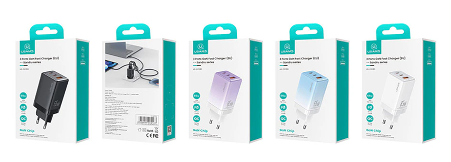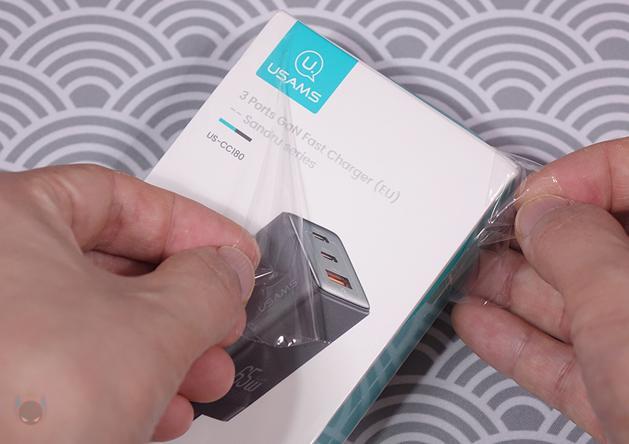 유삼스(USAMS)의 액세서리 제품군들은 대부분 박스까지 밀봉처리하는 경우가 많습니다. 고속충전기 제품도 액세서리군에 속하기때문에 65W 고속충전기 US-CC180도 박스 전체까지 밀봉처리되어 있죠. 소비자입장에선 판매제품에 신뢰를 가질 수 있는 처리라 할 수 있습니다. 그리고, 뒤에서 다시 언급하겠지만, 박스 전면에는 제품 이미지를 담고 있는데, US-CC180 충전기는 총 4가지 색상으로 나와서 각 색상별로 제품박스에 적용하고 있습니다.