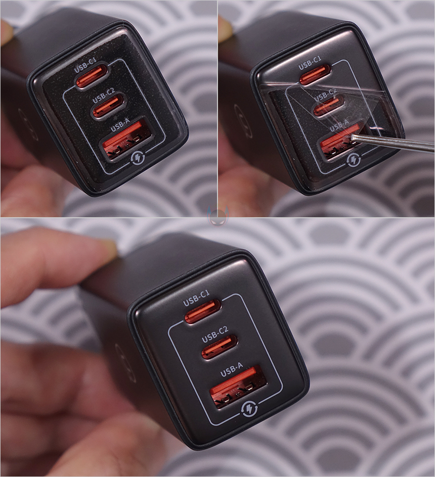 충전기를 좀 더 자세히 살펴보면, 한쪽 측면에는 USAMS 로고(Logo)를 새겨놨으며, 로고 기준 바로 오른쪽 측면에는 65W 충전표기를 해놨습니다. 그리고, 상단부분에는 USB 포트가 배치되어 있는데, 앞서 박스 패키지에서 확인했듯이, USB 포트는 총 3개 구성으로 개봉시에는 포트부분에도 보호비닐이 부착되어 있으며, 제거를 하면 무광의 메탈그레이 색상을 확인할 수 있습니다. 각 포트의 출력 지원은 싱글(Single) 1개만 사용할 때는 Type-C 포트는 최대 65W, Type-A도 60W까지 지원하며, 포트를 2개 사용할 때는 Type-C 2포트는 45+20W, Type-C1 + A 경우는 45+18W, Type-C2 + A경우는 각각 15W입니다. 그리고, 3개 모두 사용할 때는 45+15W를 출력합니다. 물론, 콘센트에 연결되는 플러그부분에 각 포트별 출력 표시를 해놨기때문에 사용전에 참고하면 되고, EU 플러그는 한국에서도 220V와 호환되죠.