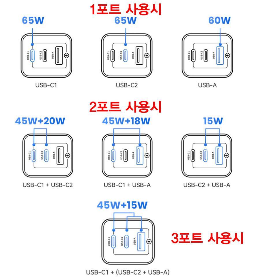 직접, 유삼스(USAMS) 65W 고속충전기 US-CC180을 사용해보면, 충전할 기기의 배터리 잔량에 따라서 고속충전기의 출력속도는 항상 달라지는데, 그래도, 65W 고속충전기답게 60W 근접으로 출력되는 것을 확인할 수 있습니다. 또한, 앞서 언급했듯이 Type-C와 A 모두 각각 60~65W를 출력하기때문에, 싱글로 사용할 때는 어느 포트를 사용해도 만족스럽다라는거죠. 3개의 포트를 갖추고 있기때문에 스마트폰, 보조배터리, 노트북 등 다양한 제품은 동시에 사용해도 되고, 슬림한 두께를 가졌기때문에 콘센트 자리차지도 없고 간섭도 없습니다.