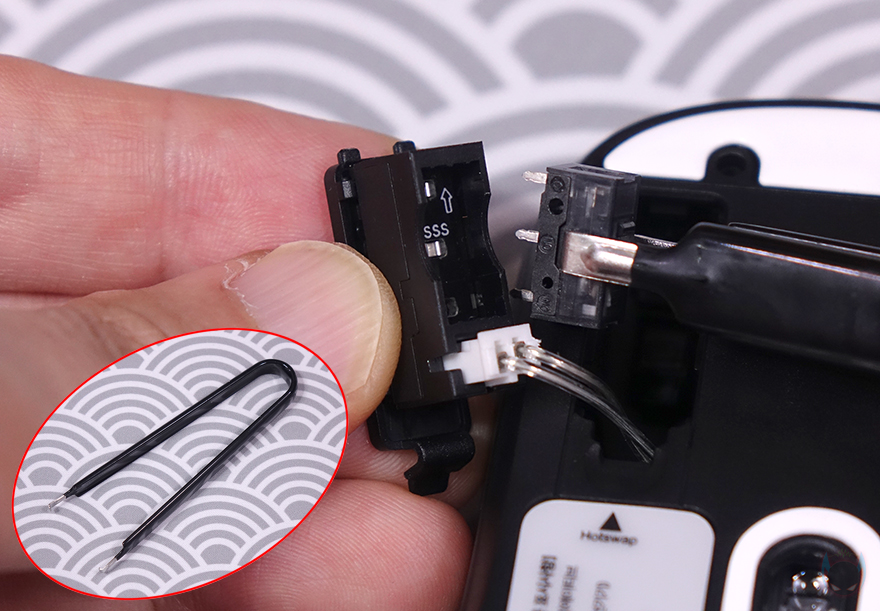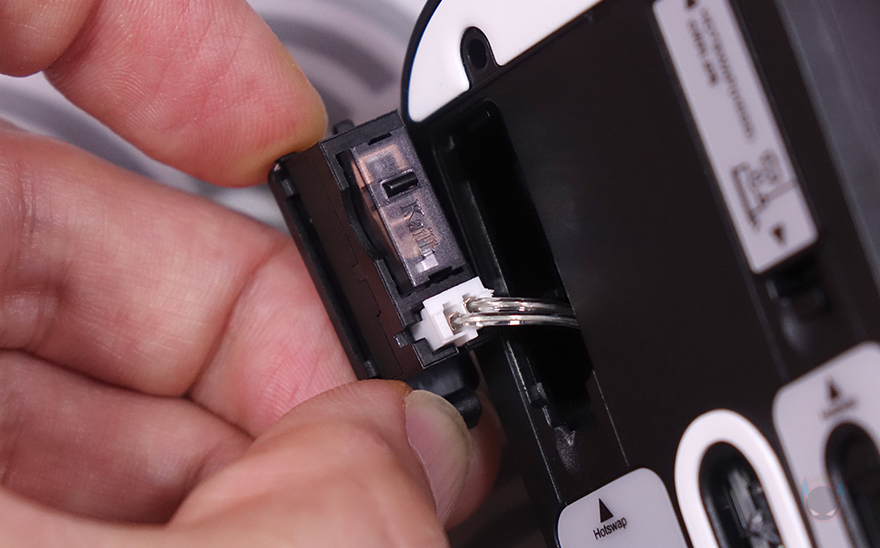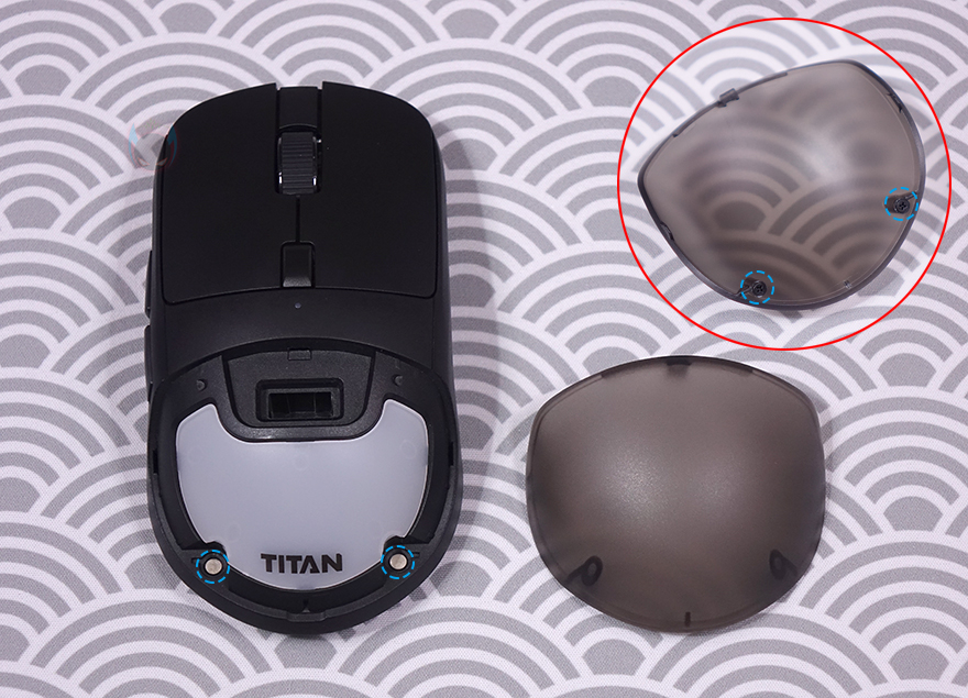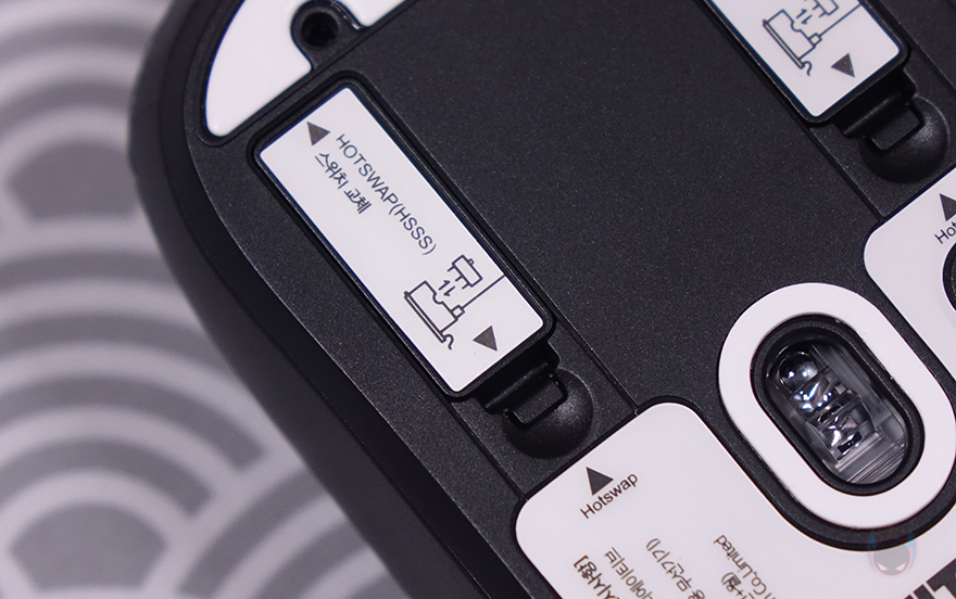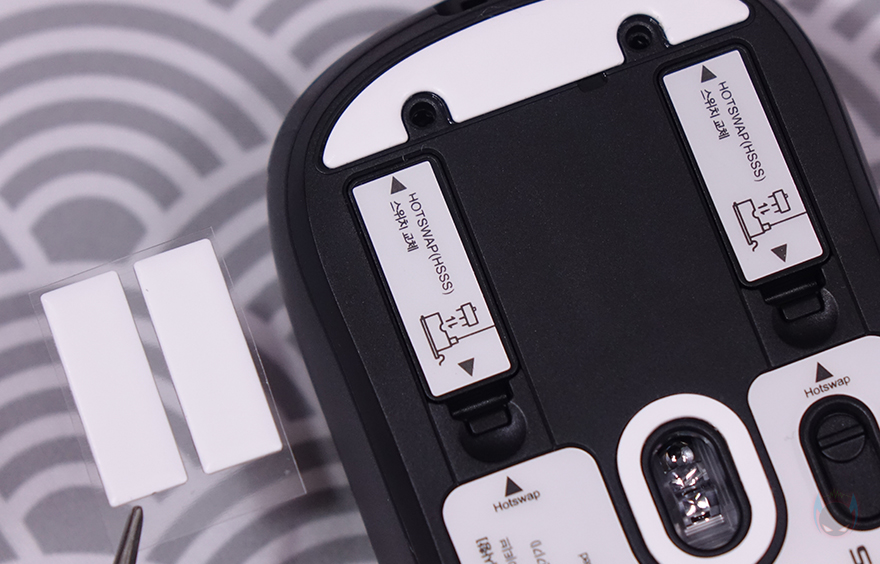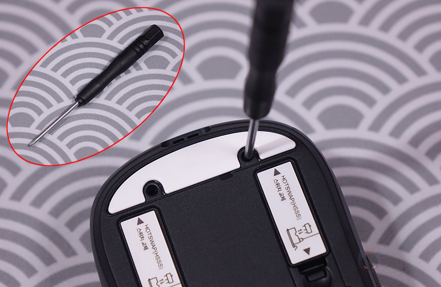 타이탄 GC 무선 마우스 밑바닥을 살펴보면, 맨 앞부분에 2개의 나사 구성이 있는데, 제공되는 +자 드라이버를 통해 기본 좌우버튼의 클릭 반발력 그러니깐 클릭압을 조절할 수 있습니다. 시계 방향으로 돌리면 반발력이 높아지고, 반시계 방향으로 돌리면 반발력이 약해지죠. 또한, 바로 아래에는 표시 문구처럼 이제품의 가장 큰 특징이라 할 수 있는 기본 좌우버튼의 스위치를 교체할 수 있는 핫-스왑 스위치의 커버로, 커버 아래쪽 홈 부분을 눌러서 올리면 쉽게 커버가 분리되는데, 이때 스위치도 함께 나옵니다. 스위치는 제공되는 집게 도구를 사용해서 그대로 위로 올리면 분리가 되죠. 참고로, 기본 장착된 스위치는 카일(Kailh) GM 8.0 스위치입니다.