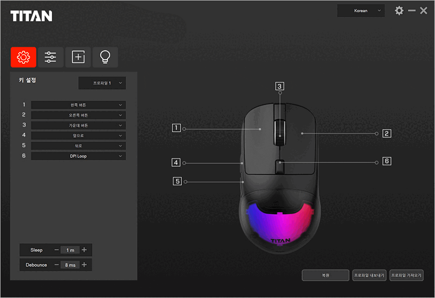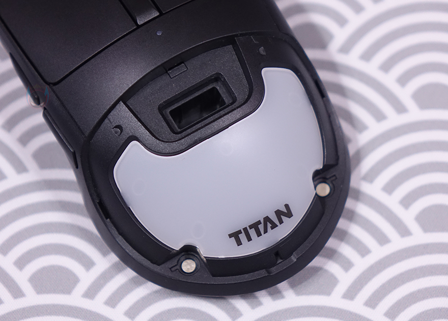 팜커버는 기본 장착 커버까지 포함해 총 4개가 제공되는데, 2개는 내부 LED효과를 볼 수 있게 반투명으로, 나머지 2개는 완전히 LED 효과를 완전히 가릴 수 있게 불투명으로 처리되어 있는데, 각각 커버 교체를 통해 높낮이조절을 할 수 있고, 높이는 2mm 차이입니다. 그리고, 뒤에서 다시 확인하겠지만, 팜커버를 분리한 상태에서 팜레스트 내부를 보면 TITAN 로고부분은 LED 효과를, 바로 위에 작은 수납공간은 무선시 사용되는 리시버를 수납할 수 있는 공간입니다. 마우스 측면은 앞서 디자인에서 잠깐 언급했듯이 오른손잡이 마우스이기 때문에 오른쪽 측면은 민짜형태이고, 왼쪽 측면은 버튼 2개가 배치되어 있습니다.
